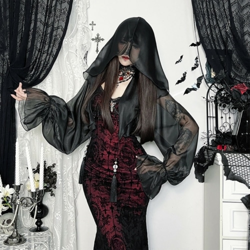 Zarter Gothic-Bolero aus transparenter schwarzer Chiffonoptik mit dramatisch weit ausgestellten Ärmeln und einer großzügigen, mystisch fallenden Kapuze. Die leichte, fließende Struktur verleiht jedem Outfit eine geheimnisvolle, schattenhafte Aura und setzt elegante Akzente über Kleidern oder Tops. Ideal für düstere Abendlooks, Rituale oder stilvolle Dark-Fashion-Inszenierungen. -