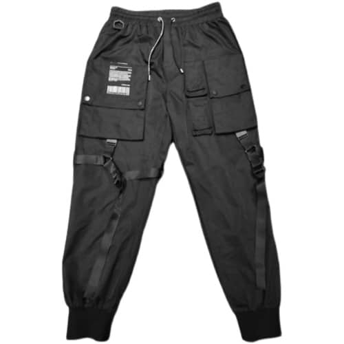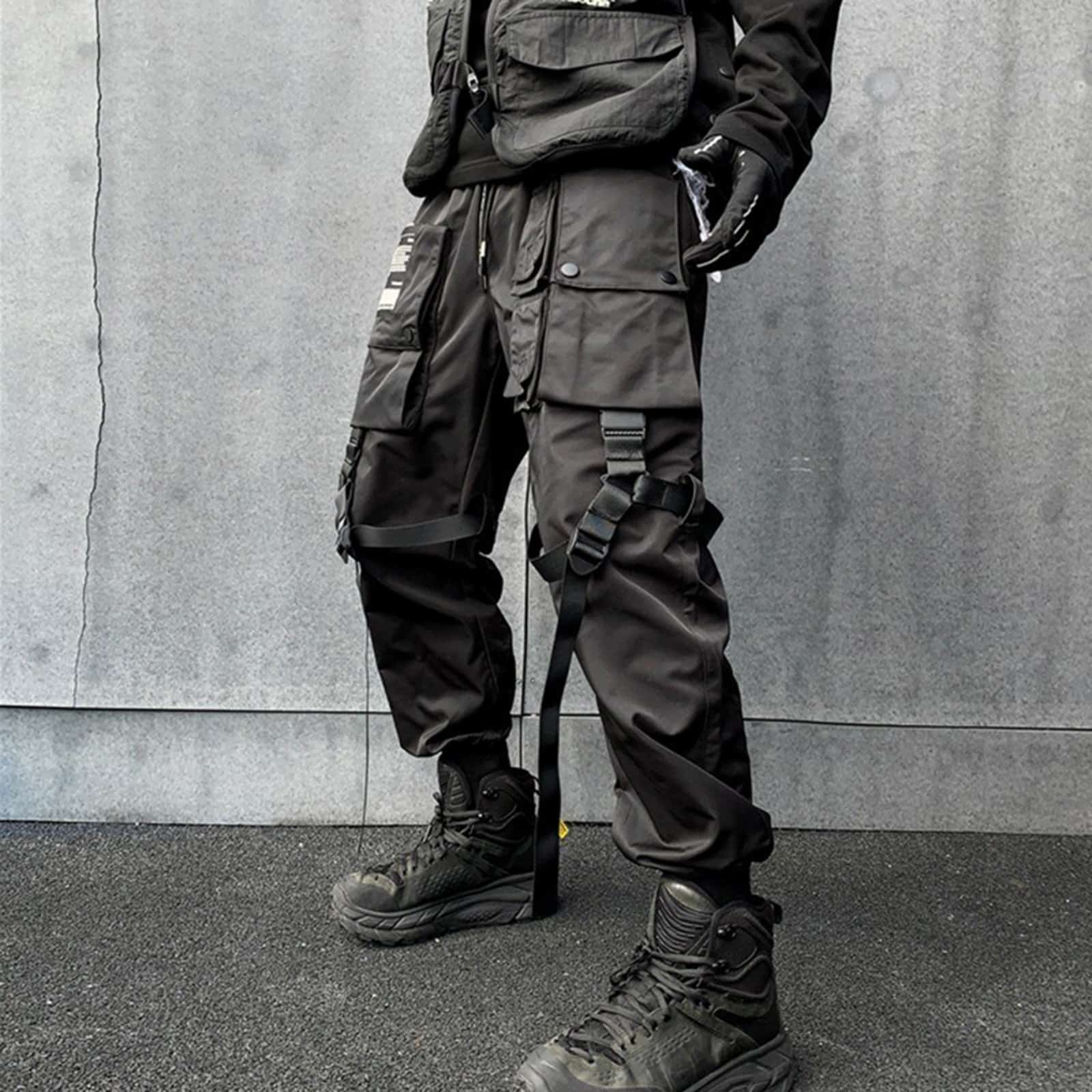 Komplett schwarze Techwear Hose mit Gummizugbund und Kordelzug. Die Beine sind mit mehreren Taschen besetzt. Verschiedene Riemen dienen zur Beinweitenregulierung. -