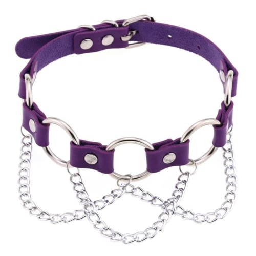 Halsband aus Kunstleder bestückt mit 5 Ringen aus Metall an denen filigrane Ketten hängen. Die Länge ist mit einer Schnalle regulierbar.