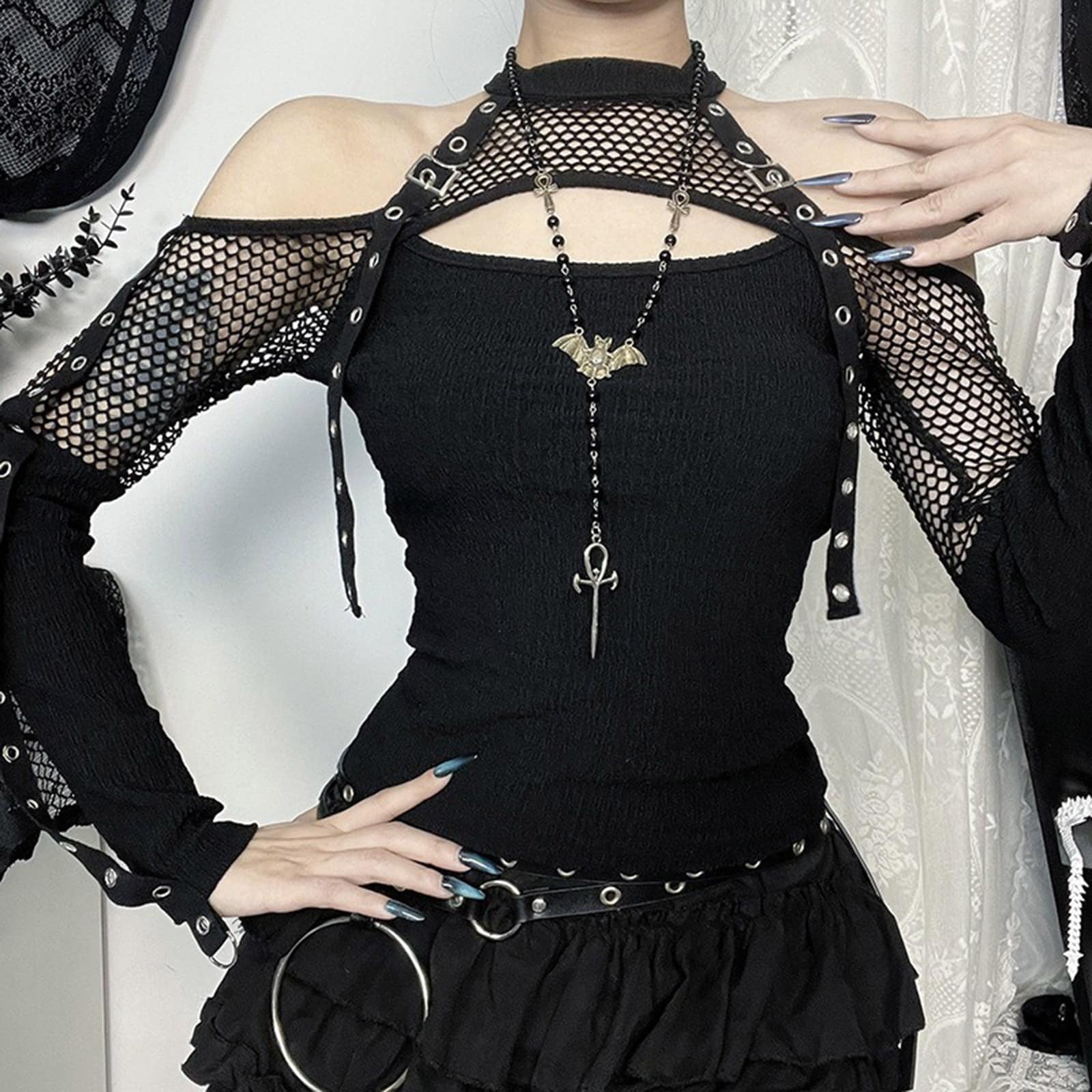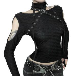 Gothic-Top aus leicht transparentem Material mit hohem Kragen und freigestellten Schultern. Im Nacken zu schließen. Verziert mit ösenbesetzten Bändern. -