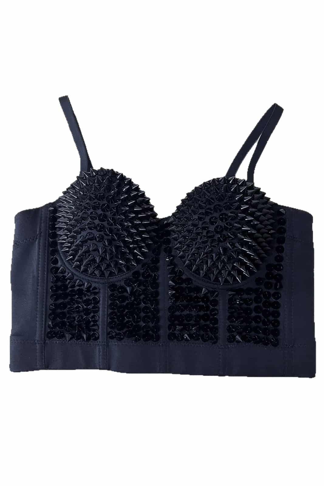Dieses BH-Top ist ein echter Blickfang – sinnlich, rebellisch und kompromisslos edgy. Die Cups sind üppig mit glänzenden, schwarzen Kunststoff-Spitznieten besetzt, die je nach Lichteinfall ein kraftvolles Spiel aus Glanz und Schatten erzeugen. Die spitzen Details verleihen dem Top eine provokante, selbstbewusste Ästhetik im Stil der Gothic- oder Fetish-Mode. Dank der klassischen Haken- und Ösen-Verschlüsse auf der Rückseite sitzt das Top sicher und formschön. Ideal für gewagte Cluboutfits, Bühnenauftritte oder mutige Fashion-Statements. -