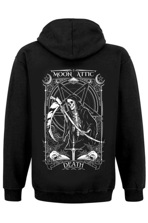 Das Motiv Death ist von düsterer Tarot- und Okkultsymbolik inspiriert und zeigt eine mystische Sensenfigur, umgeben von Pentagramm, Mondsicheln und feinen ornamentalen Linien. Totenschädel, rituelle Symbole und die kontrastreiche Schwarz-Weiß-Illustration verleihen dem Design eine zeitlose, finstere Eleganz – wie eine makabre Tarotkarte zum Anziehen, perfekt für Liebhaber von Dark Art, Gothic und okkulter Ästhetik. -