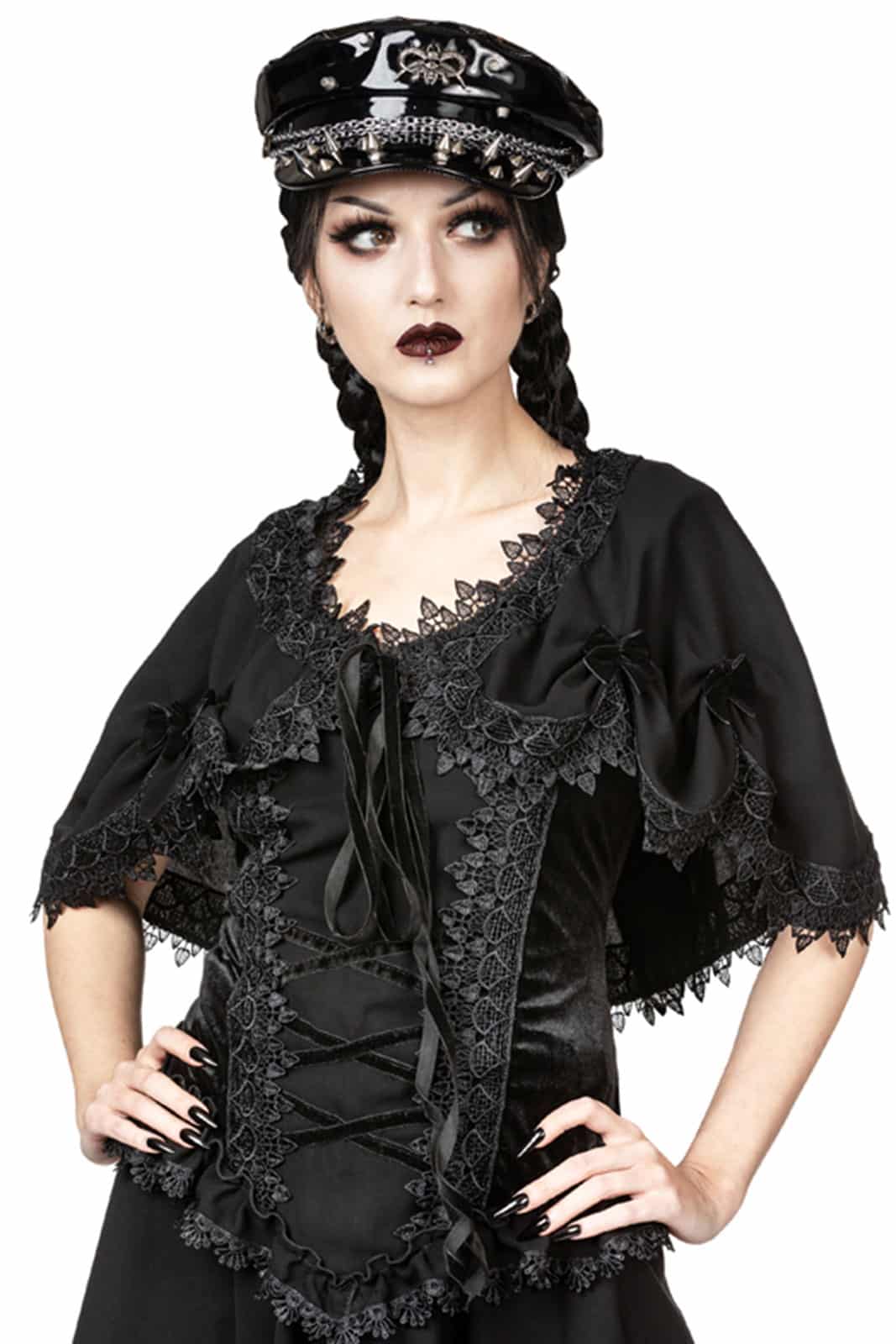 Dieses zarte Spitzen-Cape vereint viktorianische Eleganz mit einem Hauch dunkler Romantik. Aus fein gearbeitetem Netzmaterial gefertigt, zeigt es ein aufwendiges Spitzenmuster mit verspielten Bordüren und tropfenförmigen Details entlang des Saums. Die weit geschnittenen Ärmel und der kurze Schnitt sorgen für eine anmutige Silhouette, während das Satinband am Hals dem Look eine feminine Note verleiht. Perfekt als stilvolles Accessoire über Kleidern oder Tops – für einen Auftritt voller Mystik und Anmut.