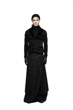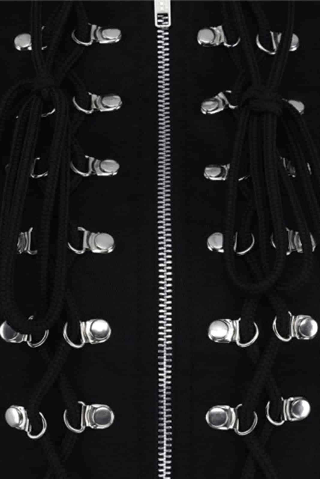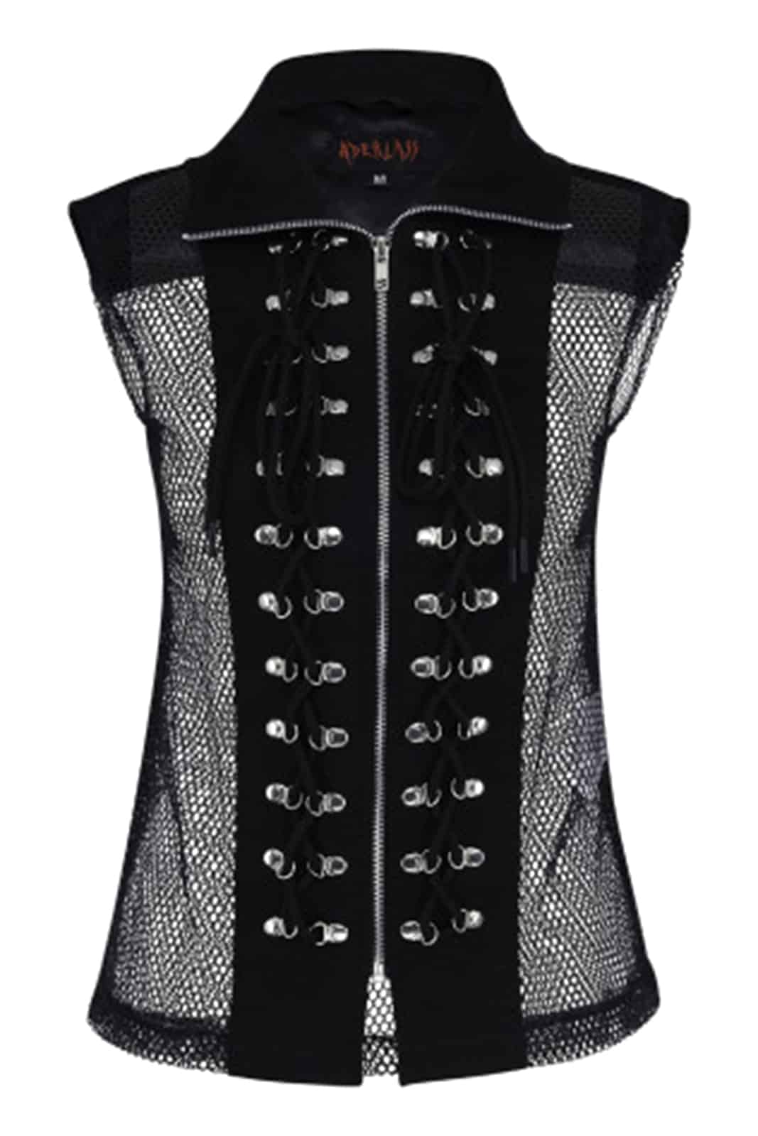 Klassisch geschnittene Herrenweste aus grobmaschigem Netzmaterial mit blickdichtem Frontpanel und Zierschnürung. Mittig verläuft ein durchgehender Reißverschluß.Mit kurzem Stehkragen und Aderlass-Logo im Nacken.