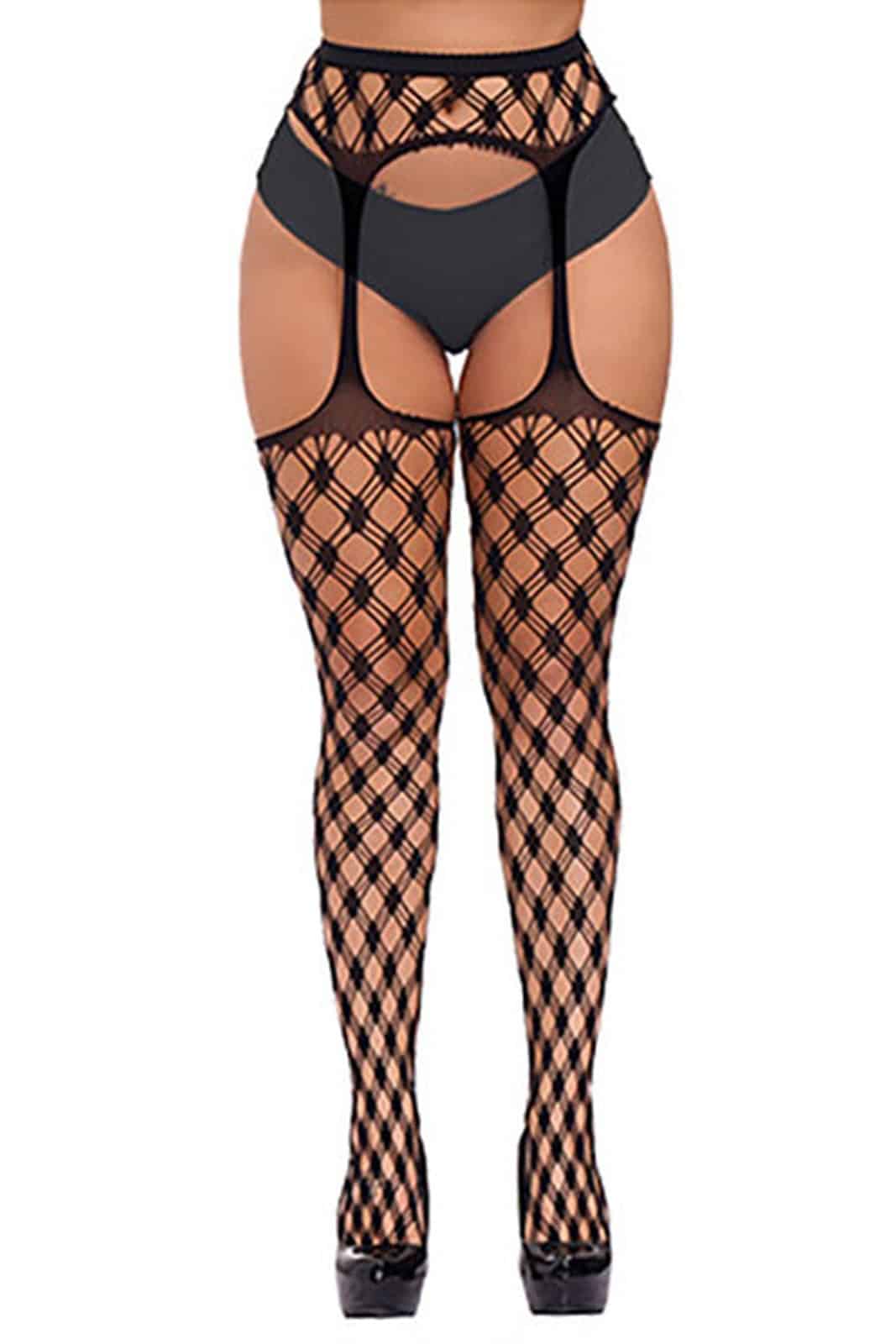 Grobmaschige Netzstrumpfhose in Form von Strümpfen mit integriertem Strapshaltern und Gürtel.