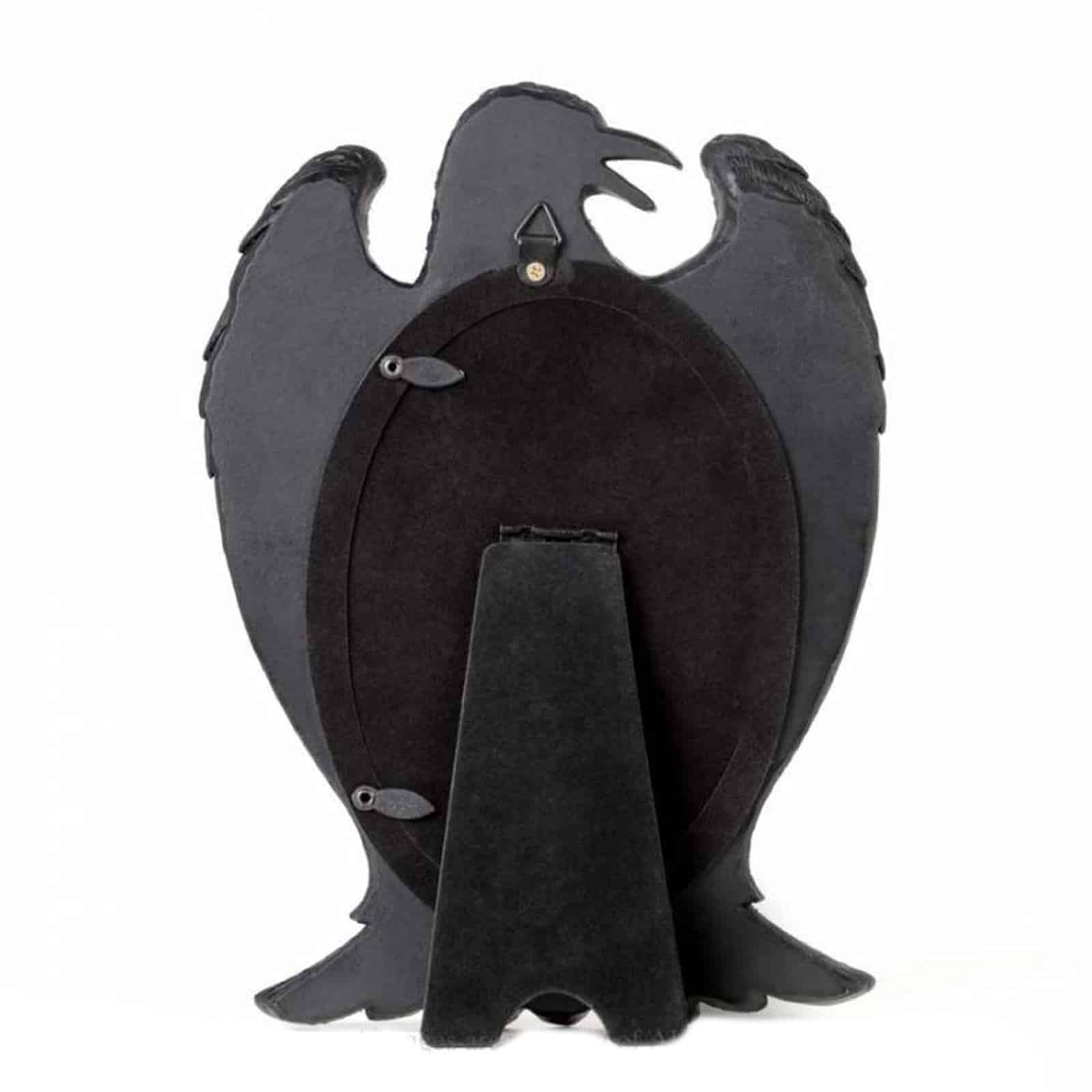 Bilderrahmen in Form eines schwarzen Rabens. Der Rahmen kann frei stehen oder an der Wand aufgehängt werden. Er bietet Platz für ein Bild/Foto in der Größe von 15,2 x 10,2 cm