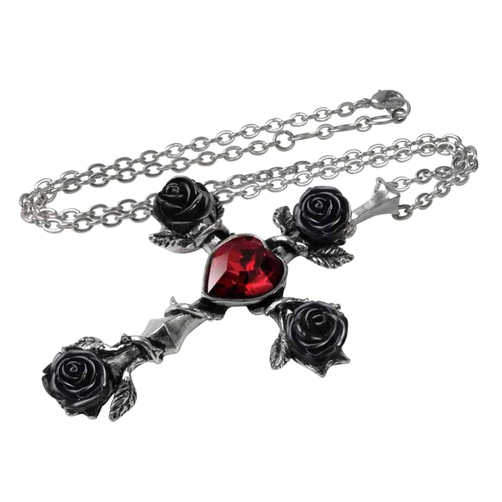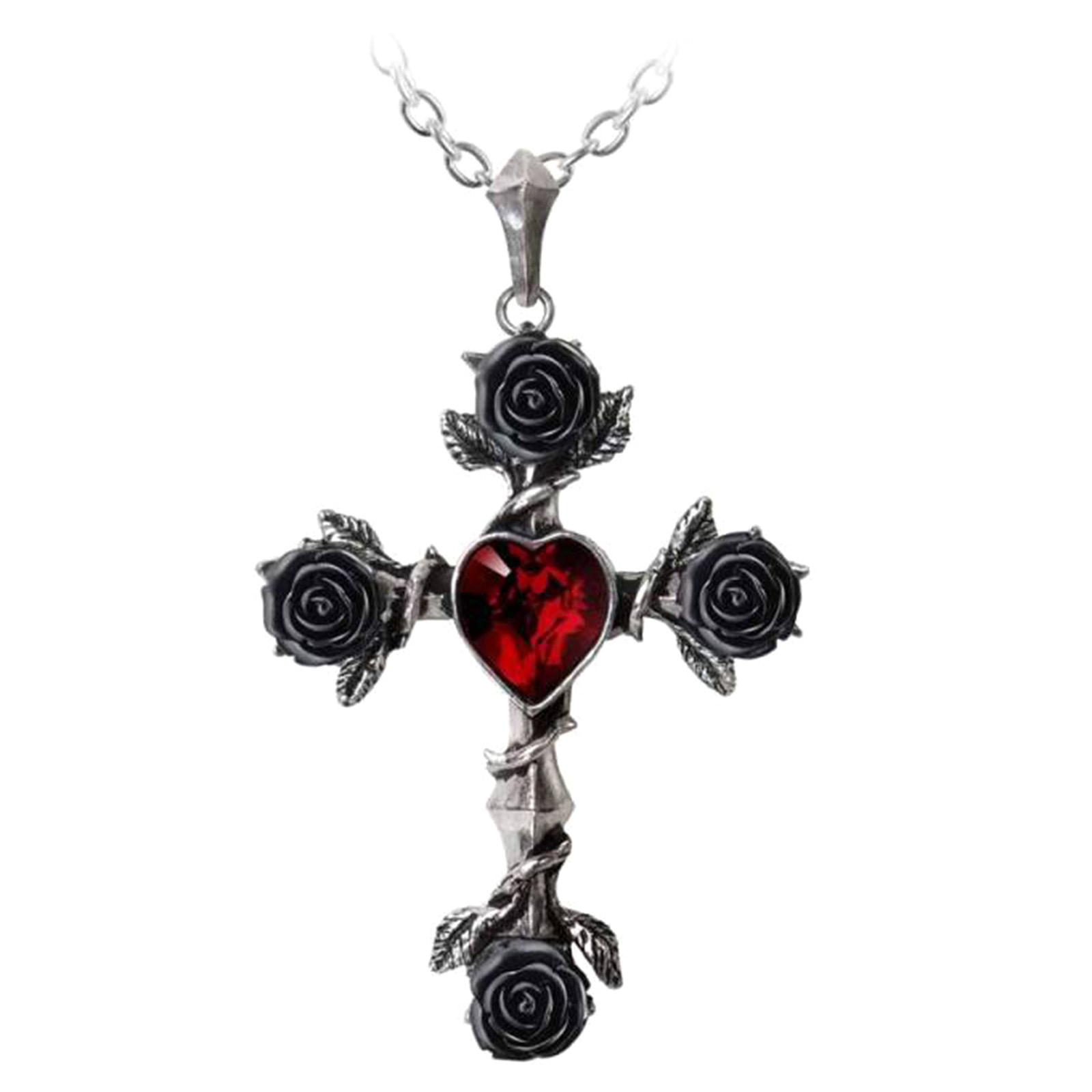 An einem Ballen hängt ein Kreuz aus poliertem Zinn mit Muscheln, das von Rosen umrankt ist, mit einem großen, roten, österreichischen Kristallherz am Schnittpunkt und Rosenblüten aus schwarzem Harz an den Armenden.