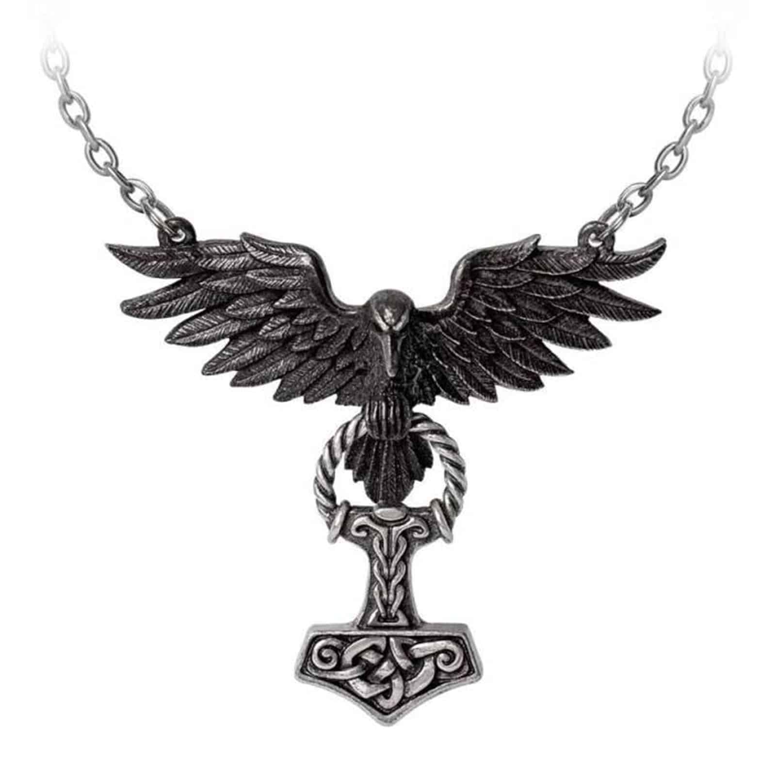 Diese aus kontrastierendem antikem Zinn gefertigte Halskette mit Rabe und Thorshammer ist nicht nur ein Accessoire, sie ist ein Ausdruck von Stärke, Heldentum und von den Wikingern inspirierter Kühnheit. Die Halskette hängt an einer nickelfreien geteilten Kette mit Karabinerverschluss und Kettenversteller.