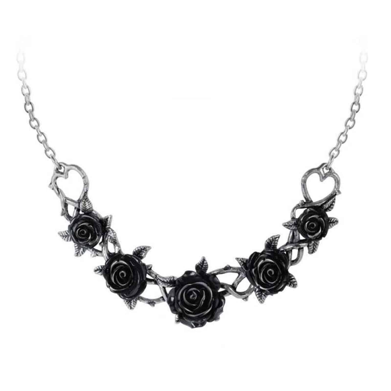 Halbmondförmige Halskette aus Rosenstielen und -blättern, besetzt mit fünf schwarzen Rosenblütenköpfen aus Kunstharz.