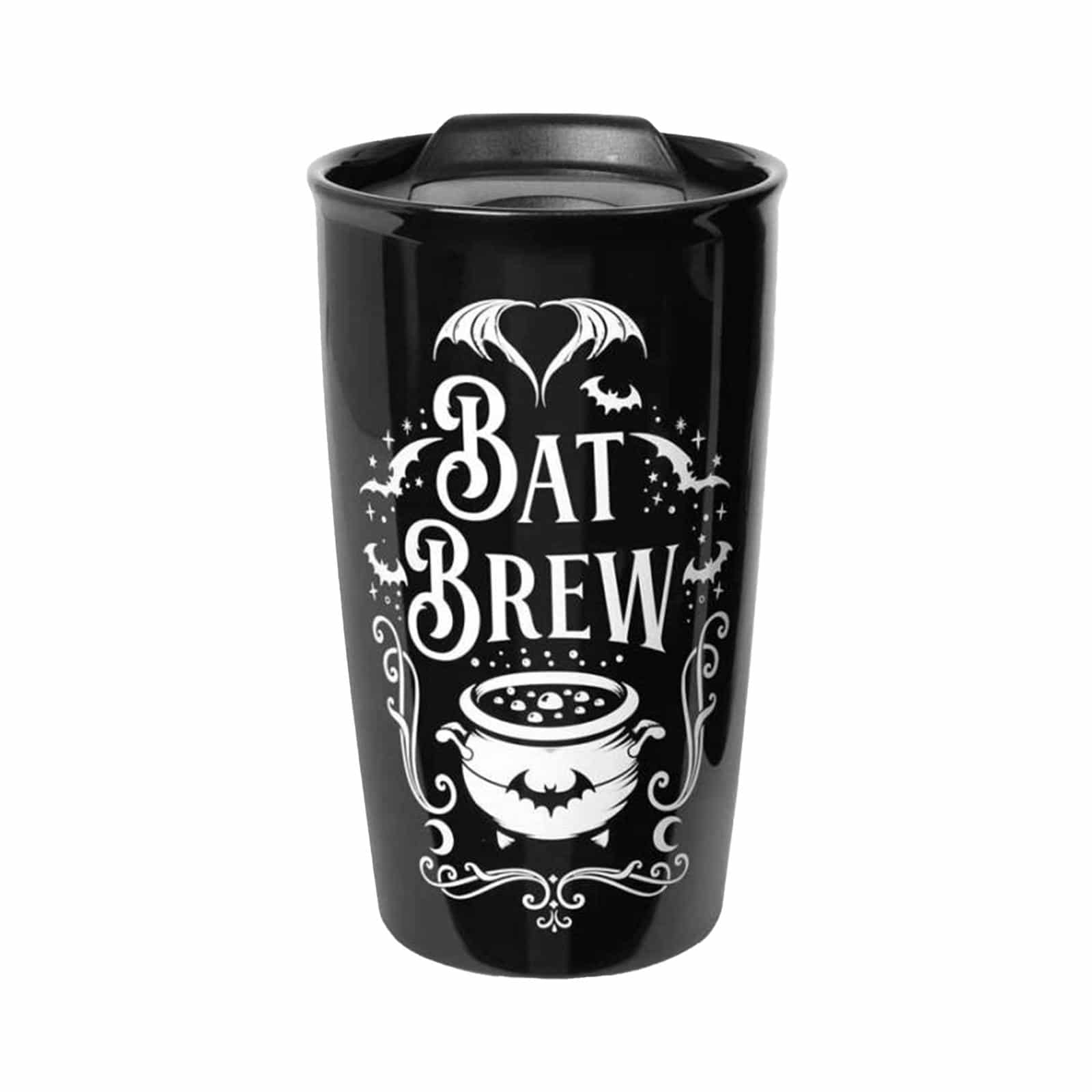 Doppelwandiger Keramikbecher mit Kunststoffdeckel und Verschlusskappe. Hält Getränke lange heiß. Mit weißem Statement Print im Bat-Style. Spülmaschinengeeignet, nicht in die Microwelle geben.