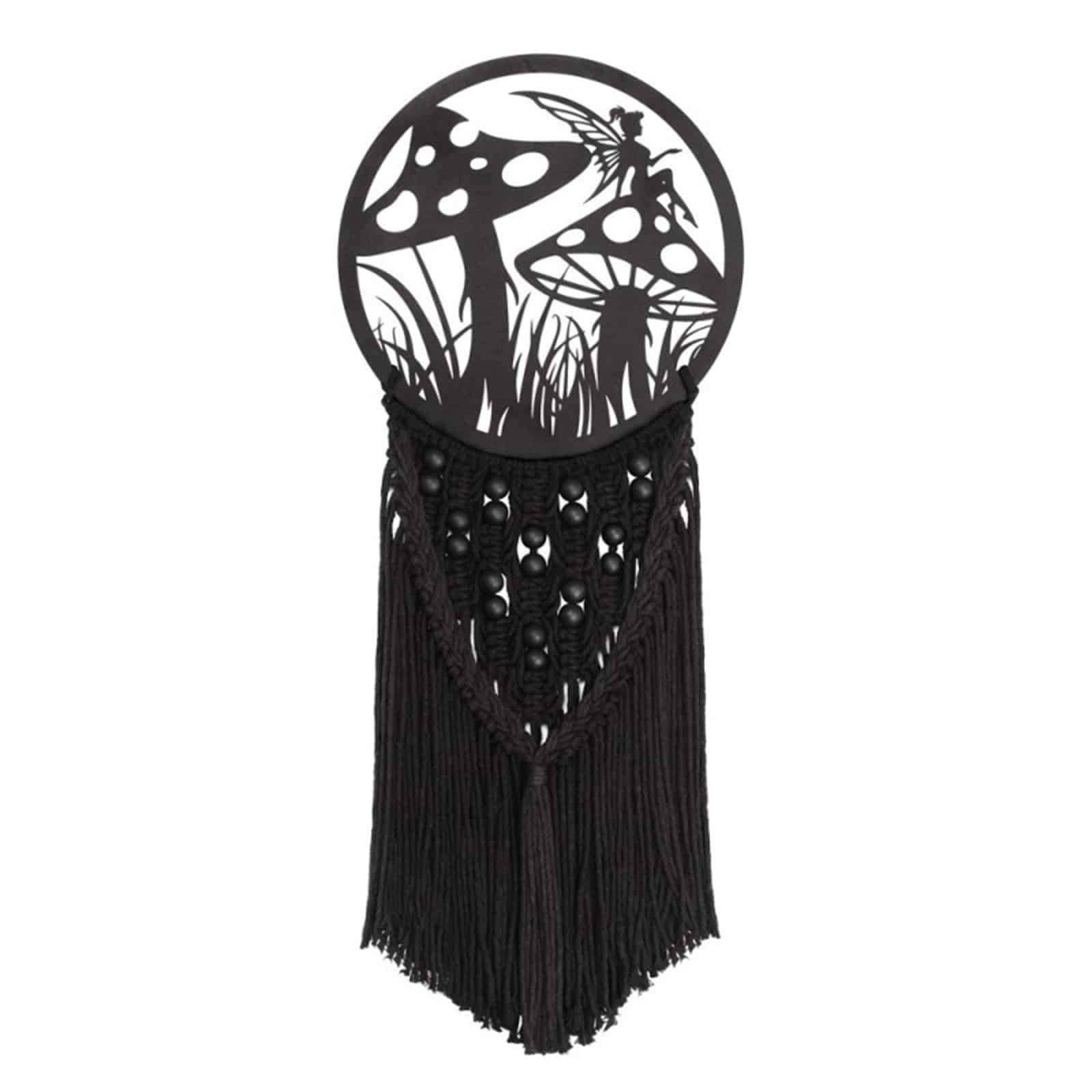Dieses handgefertigte Makramee-Wandbild lädt den Zauber des Waldes in dein Zuhause ein und verbindet mystische Symbolik mit natürlicher Ruhe. Das detailreiche Motiv zeigt eine zarte Fee auf einem Fliegenpilz, eingefasst in eine runde Silhouette und ergänzt durch kunstvoll geknüpfte Fransen und schwarze Holzperlen. Die Kombination aus filigranem Metallmotiv und weichem Makramee verleiht dem Wandbehang eine märchenhafte, spirituelle Ausstrahlung. Ideal für Boho-Interieurs, spirituelle Räume, Meditationsbereiche oder alle, die sich ein Stück verwunschenen Waldzauber nach Hause holen möchten.