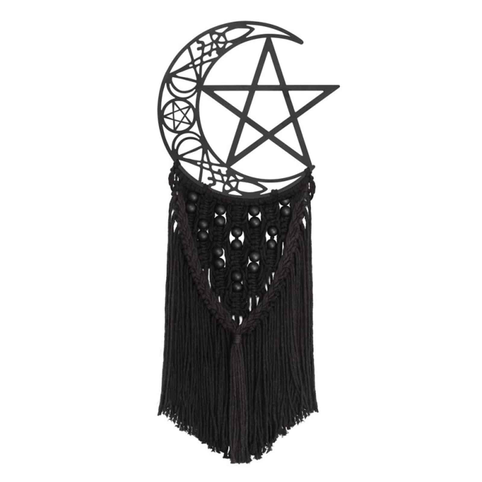 Dieser handgefertigte Macrame-Wandbehang vereint mächtige okkulte Symbole zu einem ausdrucksstarken Kunstwerk voller lunarer Energie. Der filigran gearbeitete Halbmond ist mit magischen Sigillen durchzogen und umschließt ein zentrales Pentagramm – ein starkes Zeichen für Schutz, Balance und verborgene Kräfte. Die dunkle Farbgebung, kombiniert mit tiefschwarzen Kordeln und strukturierten Knüpfungen, verleiht dem Design eine geheimnisvolle, rituelle Ausstrahlung. Ob im spirituellen Raum, im Gothic-Interieur oder als zentrales Element einer magischen Wohnatmosphäre – dieser Wandbehang schafft einen intensiven Fokus und lädt die Kraft des Mondes in dein Zuhause ein.