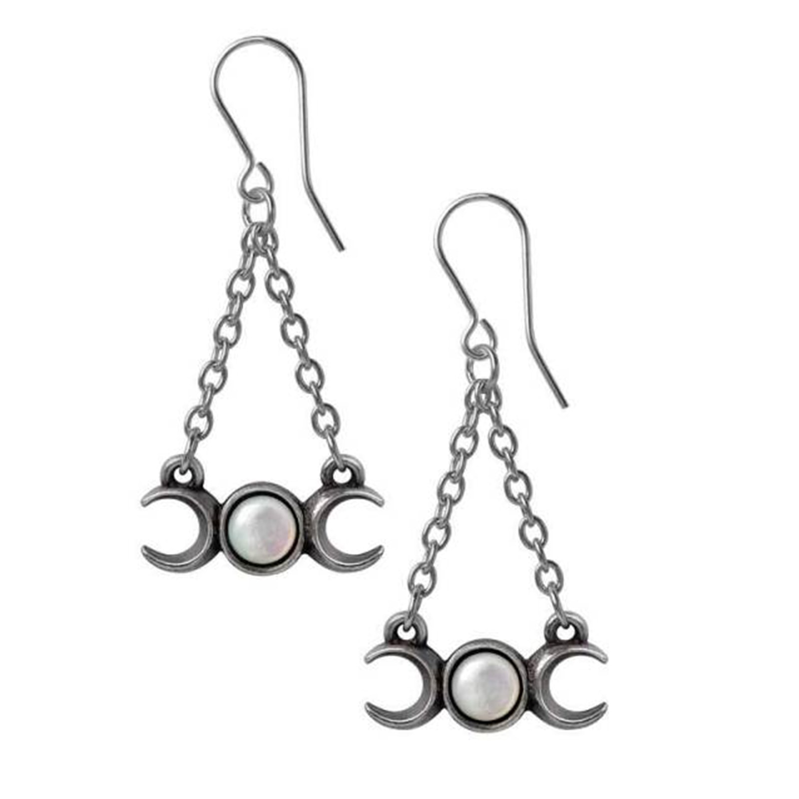 An einer doppelten feinen Kette hängen markante Dreifachmonde. Die mittleren Monde sind mit einem wunderschönen Perlmutt-Cabachon besetzt, der das Licht einfängt!