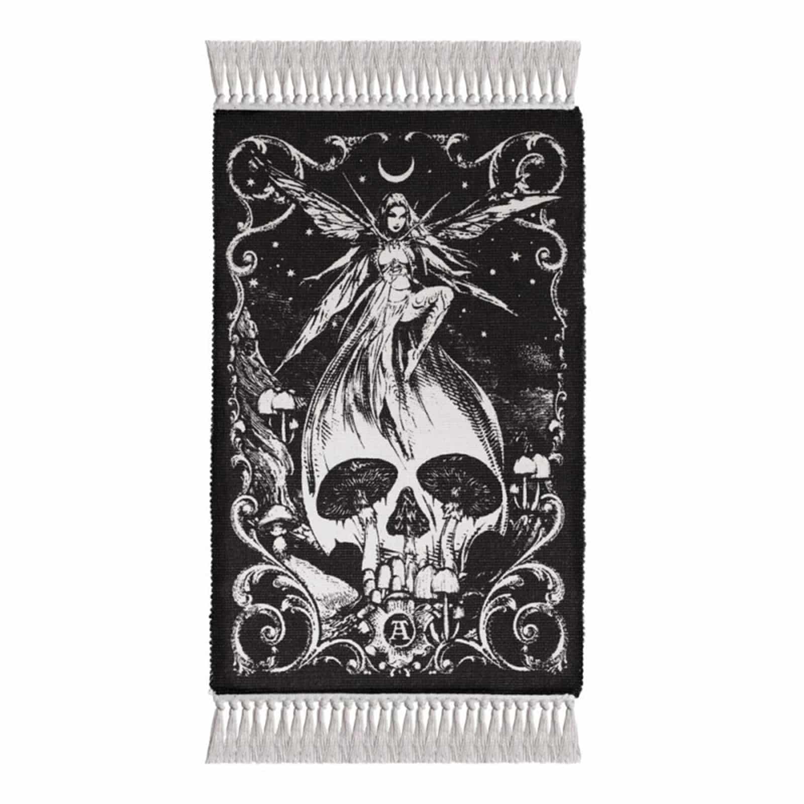 Dieser handgewebte Teppich entführt dich in eine Welt aus mondbeschienener Waldmagie und alter Hexenkunst. Im Zentrum des Motivs thront eine geheimnisvolle Alchemie-Fee auf einem aus Pilzen geformten Totenschädel, umgeben von Toadstools, nächtlicher Natur und barocken Ornamenten. Die Szene verbindet Vergänglichkeit und Zauber, Leben und Tod, und schafft eine faszinierende, mystische Atmosphäre. Ob als Bodenteppich, Wandbehang oder dekoratives Highlight auf Tisch oder Altar – dieses außergewöhnliche Design zieht alle Blicke auf sich und verleiht jedem Raum eine dunkle, märchenhafte Tiefe.