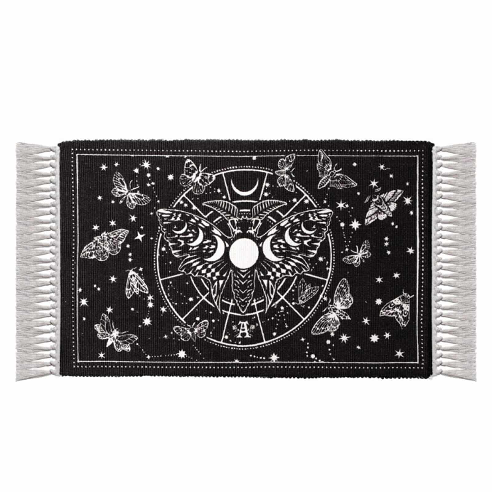 Dieser handgewebte Teppich bringt mystische Nachtenergie und kosmische Symbolik in dein Zuhause. Das eindrucksvolle Motiv zeigt eine majestätische Mondmotte im Zentrum, umgeben von weiteren Motten, Sternen und lunaren Zeichen – inspiriert vom Rhythmus des Mondes und der geheimnisvollen Welt nachtaktiver Wesen. Das kontrastreiche Design in Schwarz und Weiß wirkt zugleich magisch und modern und macht den Teppich zu einem besonderen Blickfang auf dem Boden, an der Wand oder auf einem Tisch. Als Teil der außergewöhnlichen Alchemy Home & Gift Kollektion verbindet dieses Stück Mythologie, Natur und Ästhetik zu einem ausdrucksstarken Wohnaccessoire.