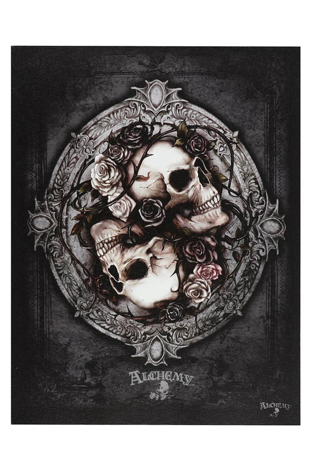 Hochwertiger Druck im Occult Style auf Leinwand. Das Motiv zeigt ein zwei Schädel mit Reißzähnen eingehüllt in Rosen und Dornen. Wird mit Ösen und Schrauben zum Aufhängen geliefert.