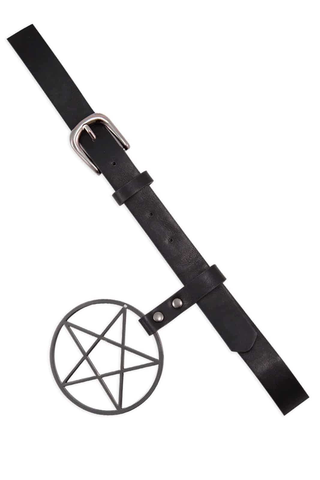 Gothic Gürtel aus veganem Kunstleder mit einer Schnalle aus Metall und einem Pentagram-Anhänger an einer Lasche.Breite ca. 2 cm
