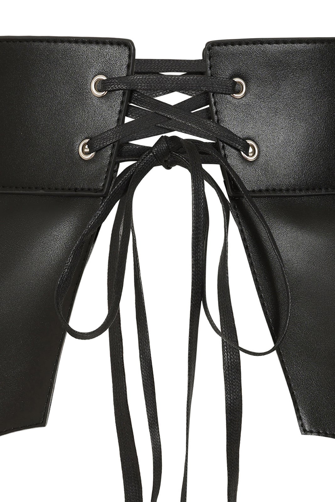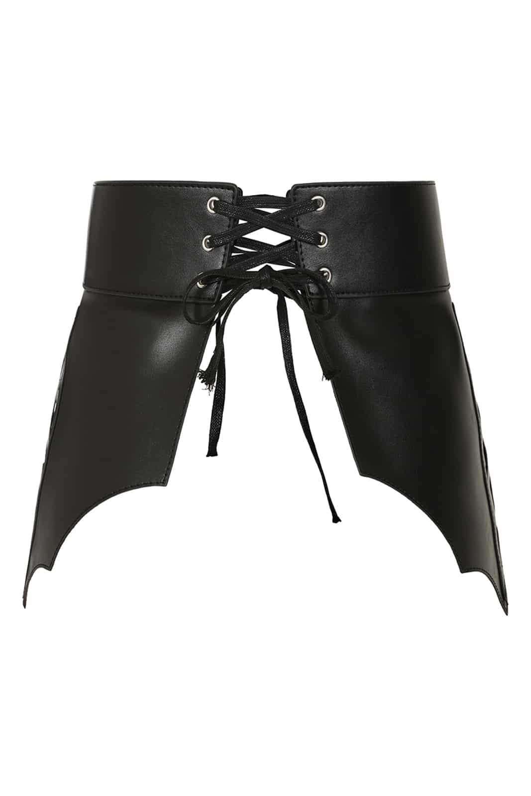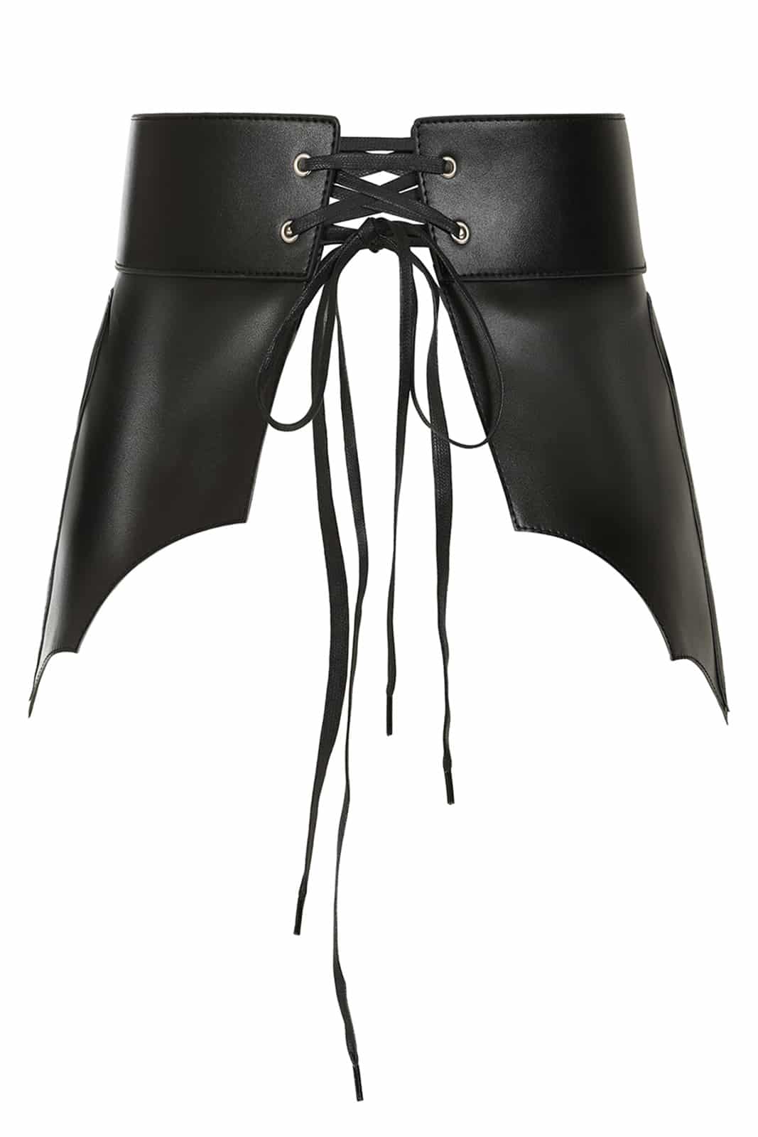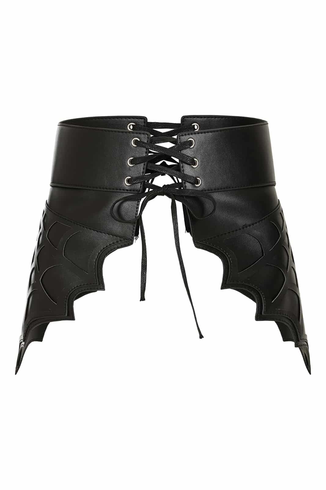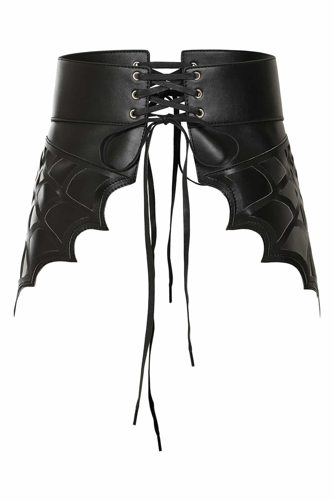 Gothic Gürtel aus Kunstleder in Form von gruseligen Fledermausflügeln, die zusätzlich mit Spinnennetzen verziert sind. Vorn und hinten mit einer Schnürung zu schließen.