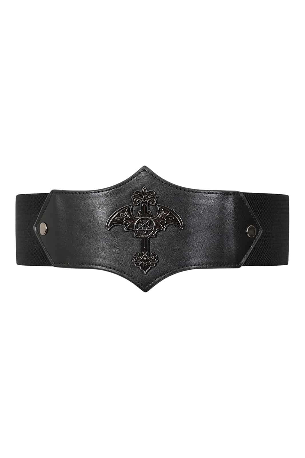Der Wicked Taillengürtel von Banned ist das perfekte Accessoire für ein starkes Gothic-Statement. Der elastische Bund sorgt für eine bequeme Passform, während das auffällige Kreuzornament mit Fledermausflügeln dem Gürtel seinen düsteren, extravaganten Charakter verleiht. Ideal, um schlichte Outfits aufzuwerten oder deinem Look den letzten Schliff zu geben.