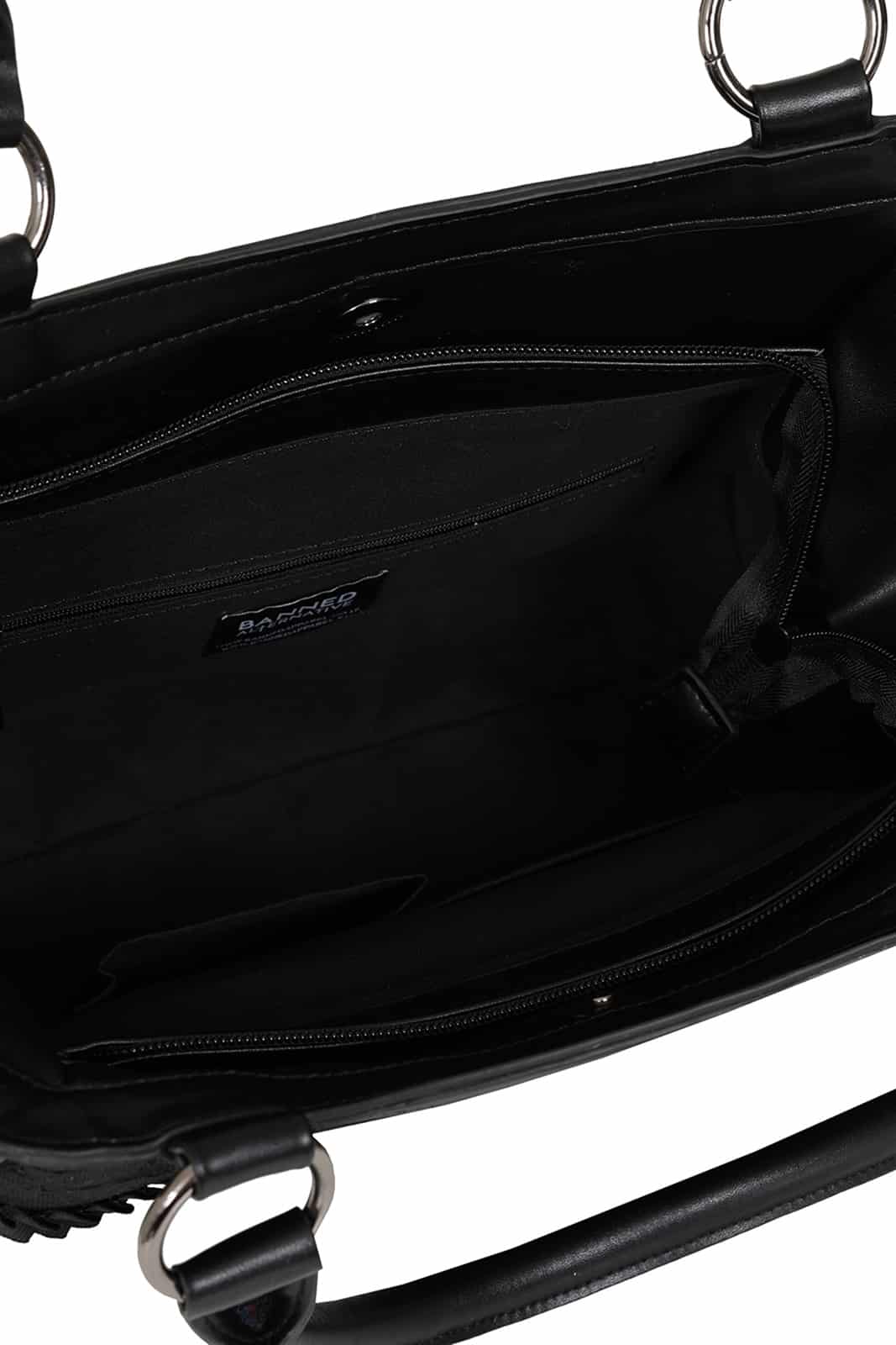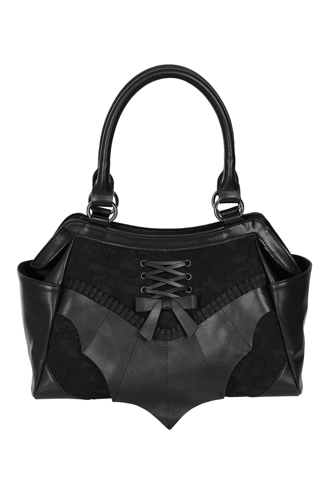 Geräumige Handtasche verziert mit Fledermausflügeln, Schleife und Zierschnürung, unterlegt mit zartem Spitzenstoff. Das vollständig gefütterte Hauptfach ist mit einem Magnetverschluß und darunterliegendem Reißverschluß sicher verschlossen. Weiter finden sich im Innern zwei Einschubfächer und ein Reißverschlußfach.