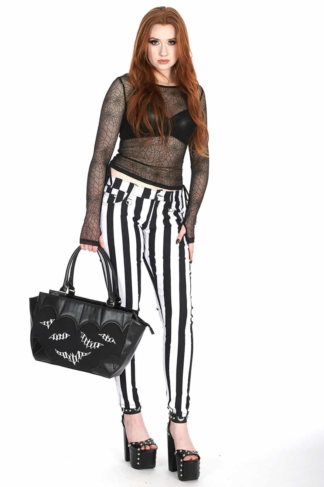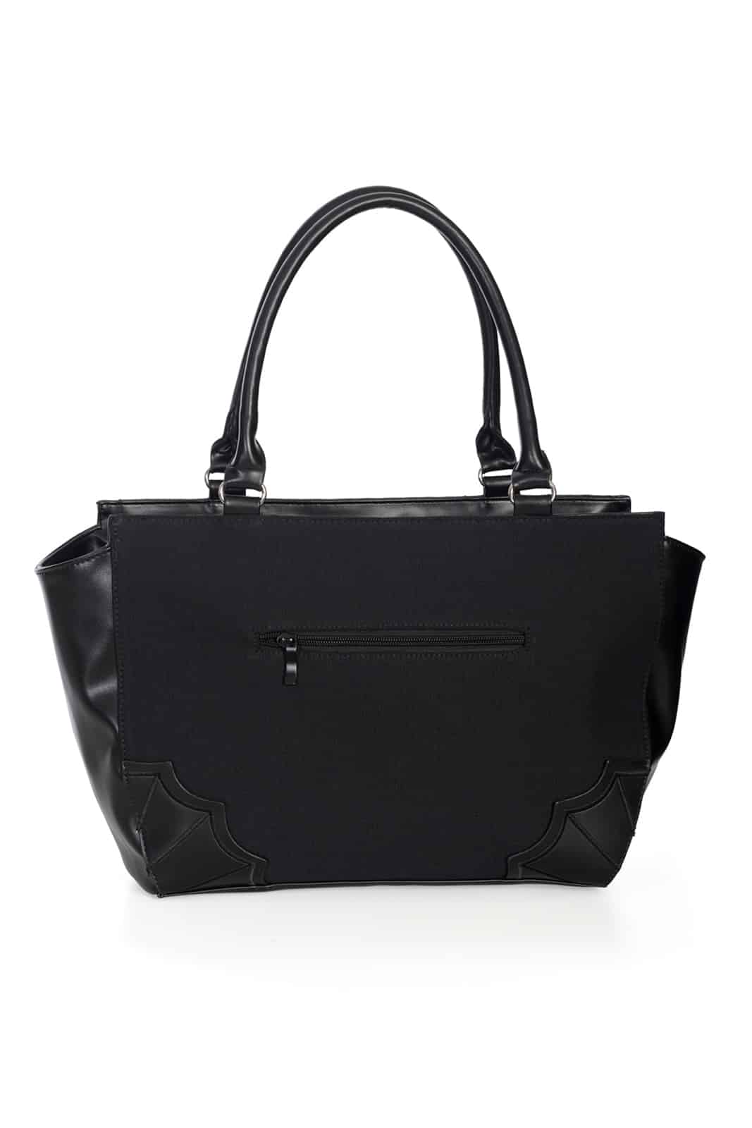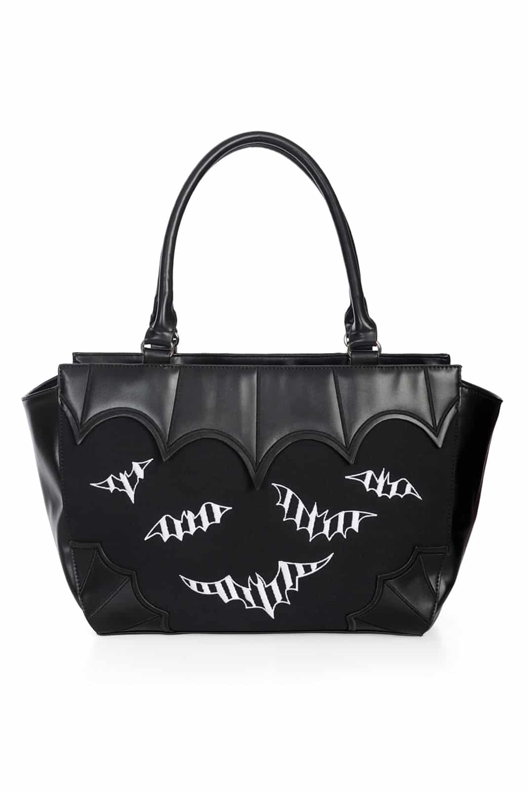Geräumige Handtasche aus robustem und widerstandsfähigem Textil mit Kunstlederakzenten am Boden und an der oberen Öffnung. Das Design erinnert an Fledermausflügel. Die Front ist mit weißen Fledermäusen bestickt. Innen vollständig gefüttert und mit Taschen versehen.