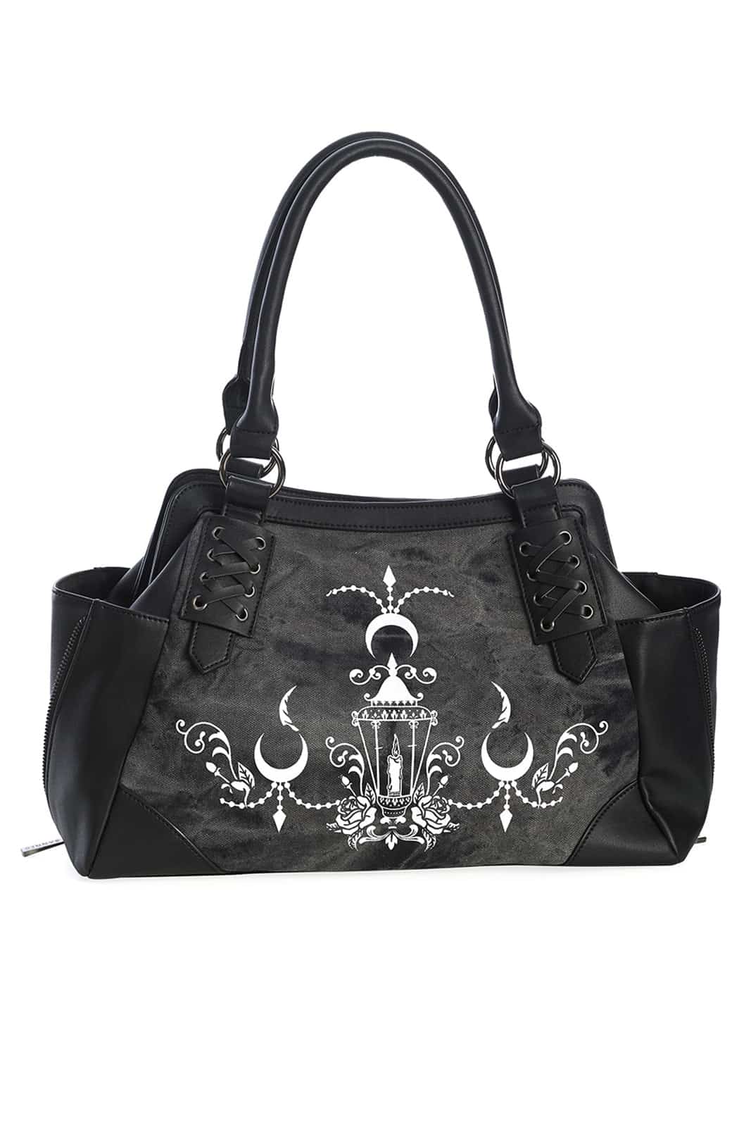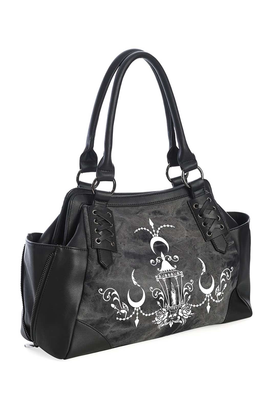 Aufwändig gestaltete und geräumige Henkeltasche. Der Boden und die Seiten sind aus widerstandsfähigem Kunstleder gefertigt. Die Front ist mit einem wunderbaren Kronleuchter bedruckt. Auf der Rückseite ist eine kleine Reißverschlußtasche verarbeitet. Nach dem Öffnen des Klickverschlusses finden sich im Innern nebst einer kleinen Reißverschlußtasche zwei weitere Einschubtaschen.