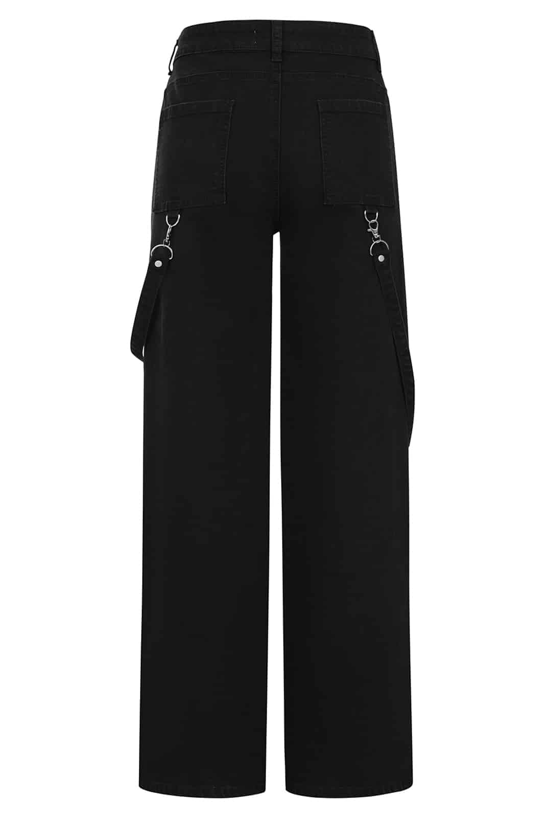 Diese schwarze Banned Hose vereint Utility-Stil mit einem Hauch Industrial-Ästhetik. Breite Hosenbeine, Netzeinsätze an den Oberschenkeln und diagonale Stoffapplikationen mit silberfarbenen Nieten sorgen für einen markanten Look. Abnehmbare Riemen mit Metallringen und Karabinern betonen den alternativen Charakter. Der hohe Bund mit Knopfverschluss und Gürtelschlaufen bietet sicheren Sitz und Komfort – ein Statement-Piece für jedes Gothic- oder Streetwear-Outfit.