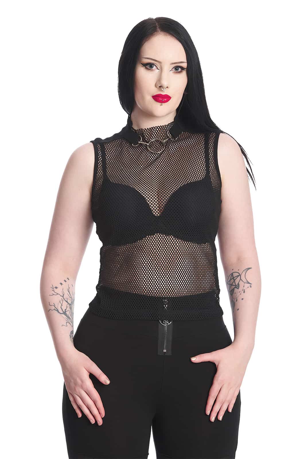 Ärmelloses Netzshirt mit Schulterverstärkung und kurzem Reißverschluß im Nacken. Zwei Karabiner halten einen großen silbernen O-Ring und lassen diesen wie ein integriertes Halsband wirken. Das Stretch-Gewebe liegt angenehm auf der Haut.