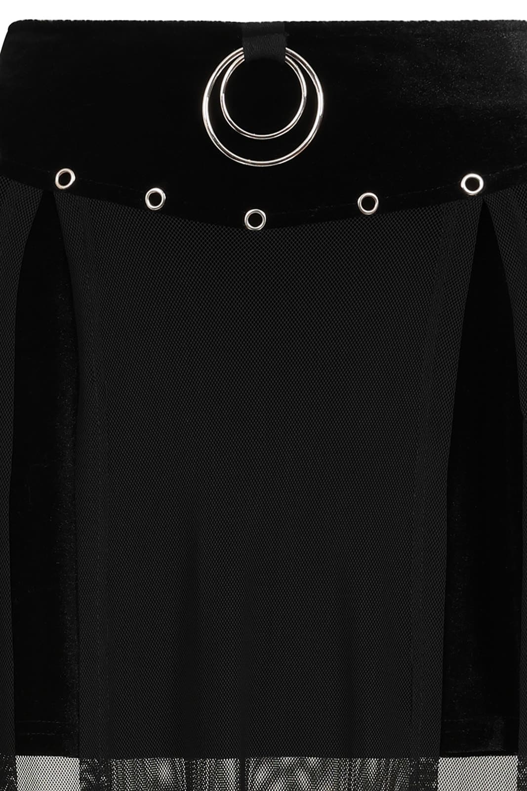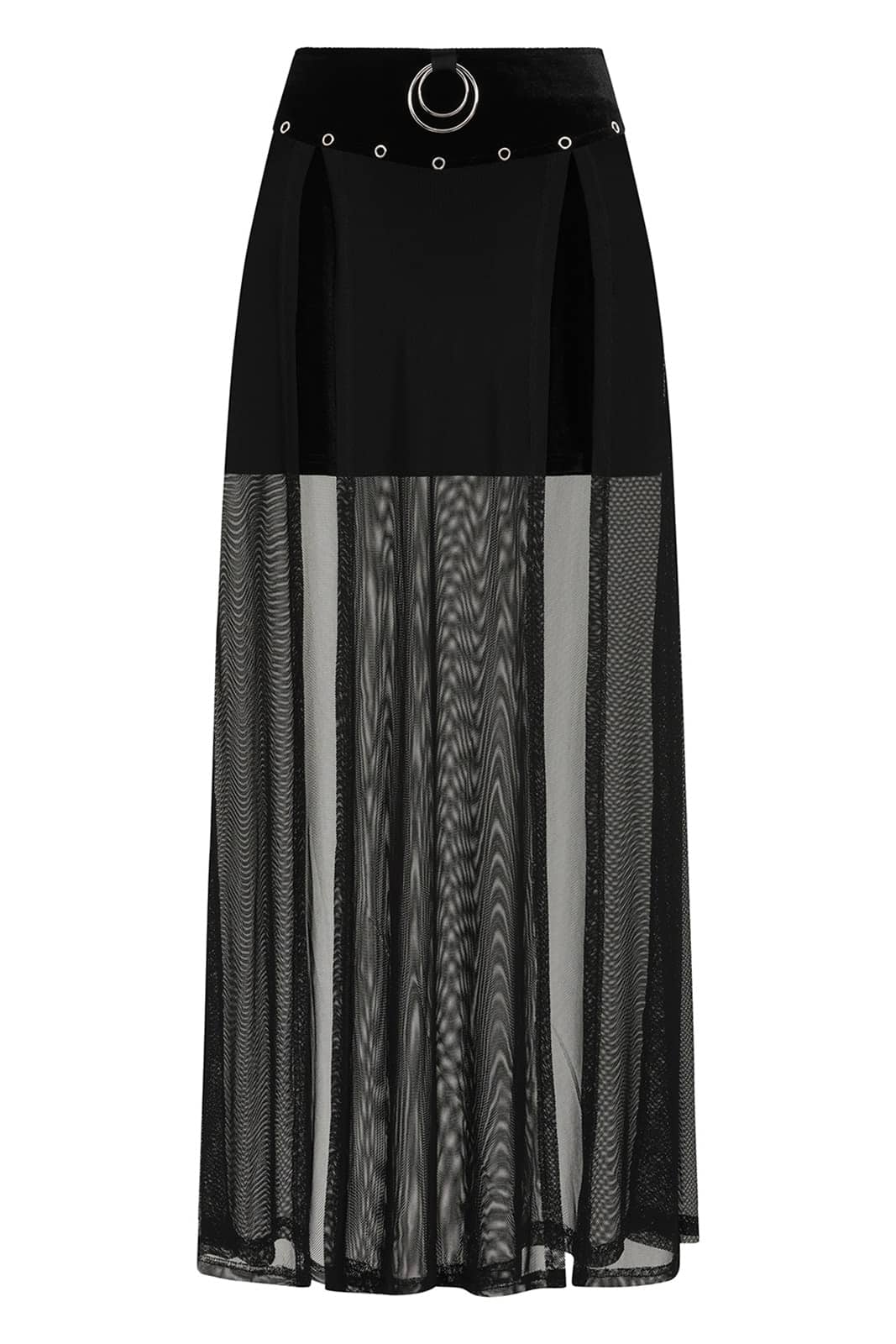 Dieser lange Rock von Banned verbindet luxuriösen Samt mit leichtem Mesh und sorgt so für eine dunkle, mystische Ausstrahlung. Der Samtbund mit silbernen Ösen und markantem Ringdetail setzt ein punkig-gothisches Statement, während der transparente Netzstoff sanft fällt und für einen dramatischen Kontrast sorgt. Ein ausdrucksstarkes Stück für alle, die ihren alternativen Style betonen möchten.