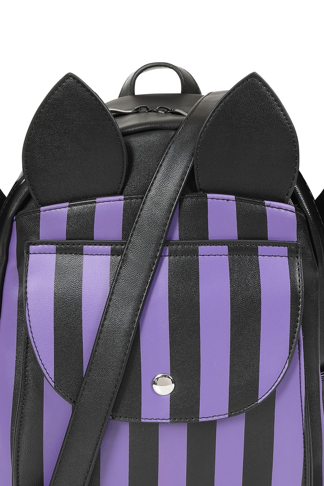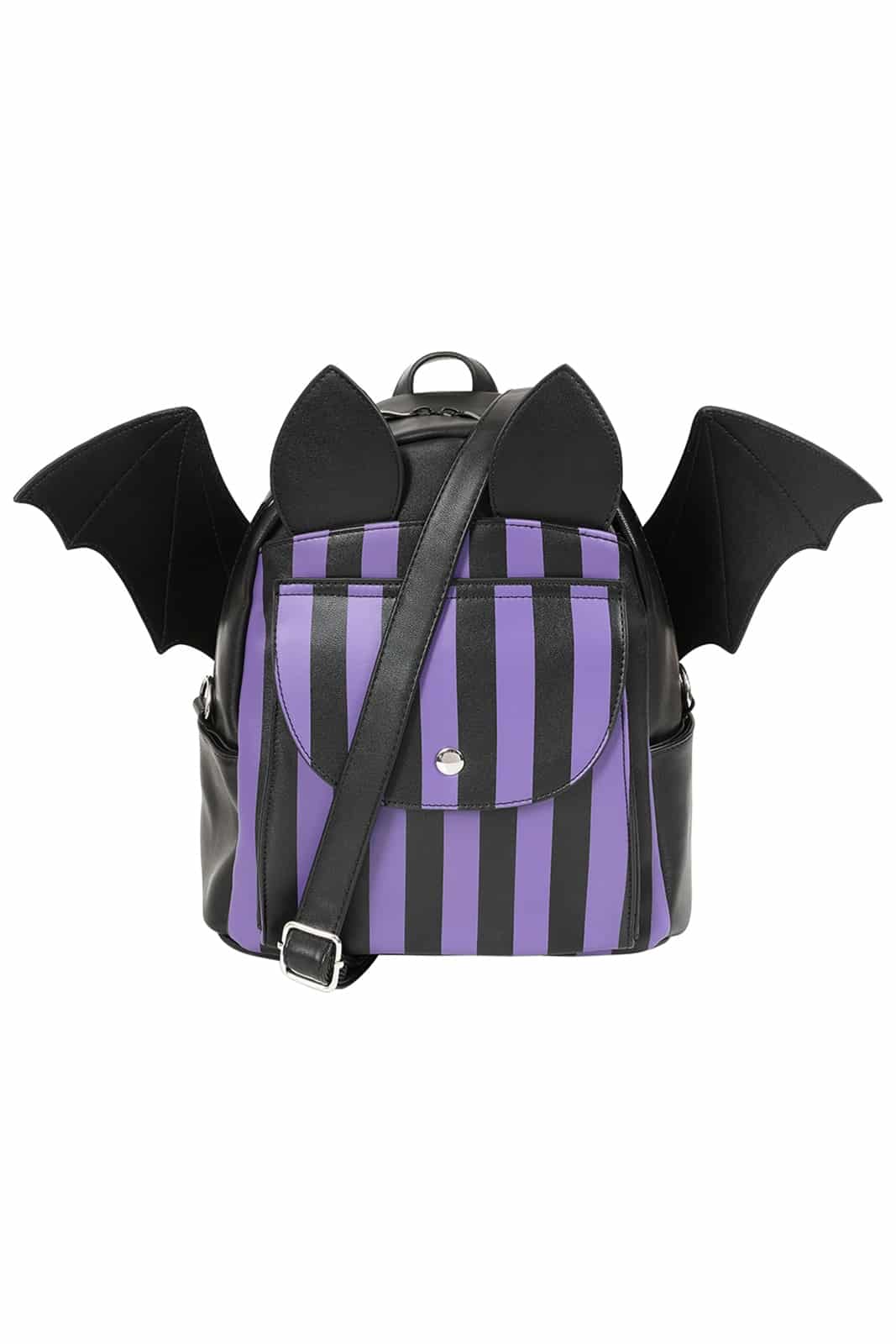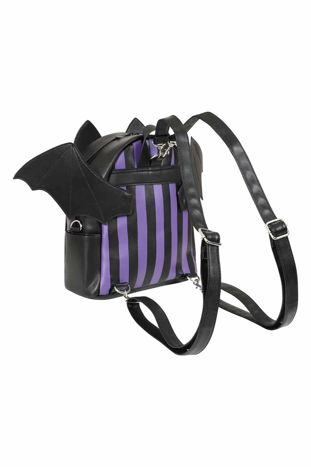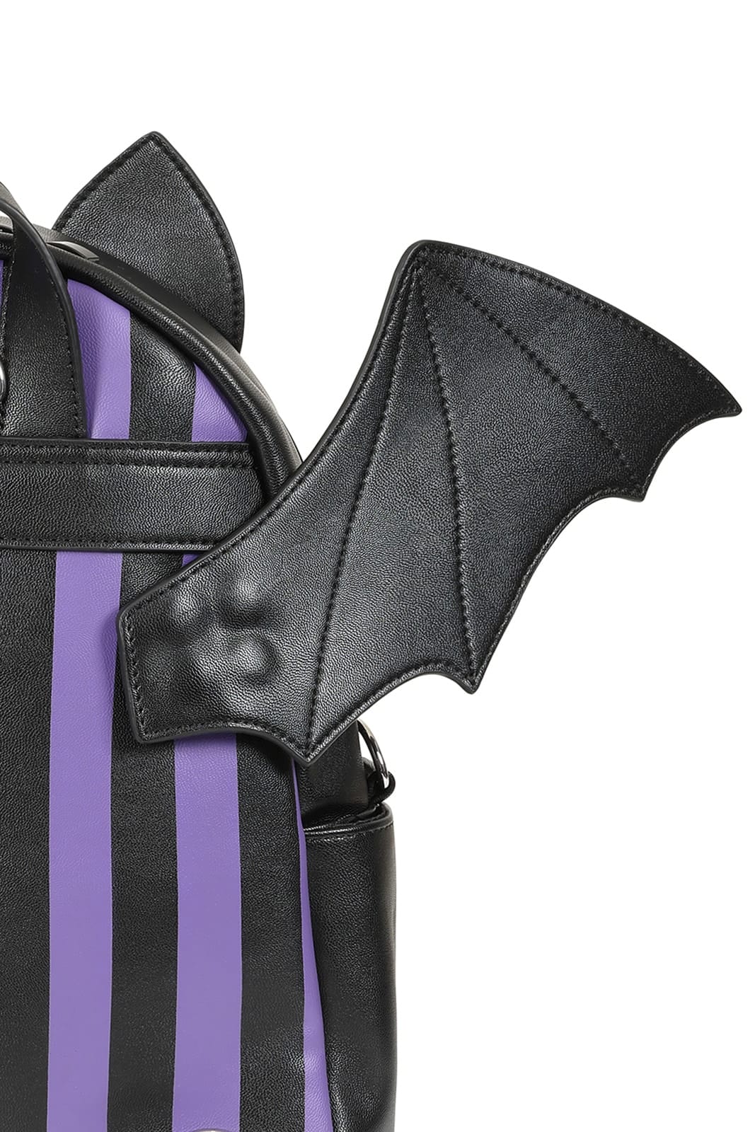 Der Nightfall Bat Rucksack ist ein auffälliges Gothic-Accessoire mit auffälligen schwarz-lilanen Längsstreifen und abnehmbaren Fledermausflügeln. Dieser einzigartige Rucksack vereint verspielte Halloween-Ästhetik mit praktischer Alltagstauglichkeit. Das unverwechselbare Design umfasst abnehmbare schwarze Fledermausflügel, die je nach Stilvorliebe hinzugefügt oder entfernt werden können. Dadurch eignet er sich sowohl für Statement-Gothic-Mode als auch für die Freizeit.