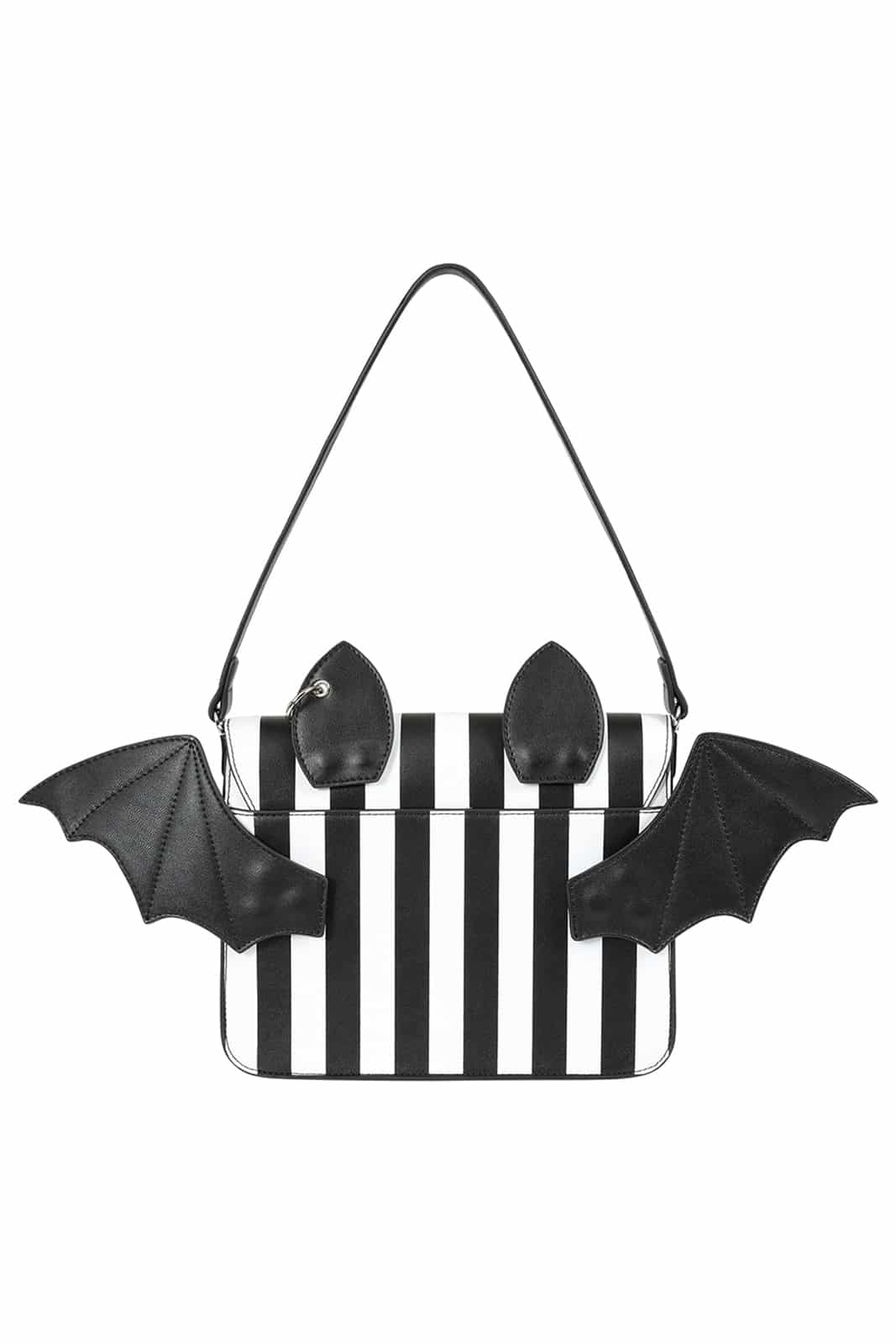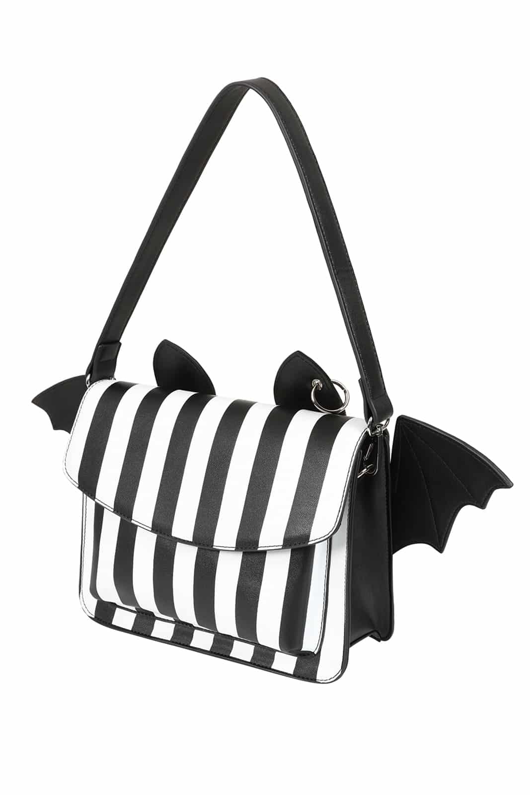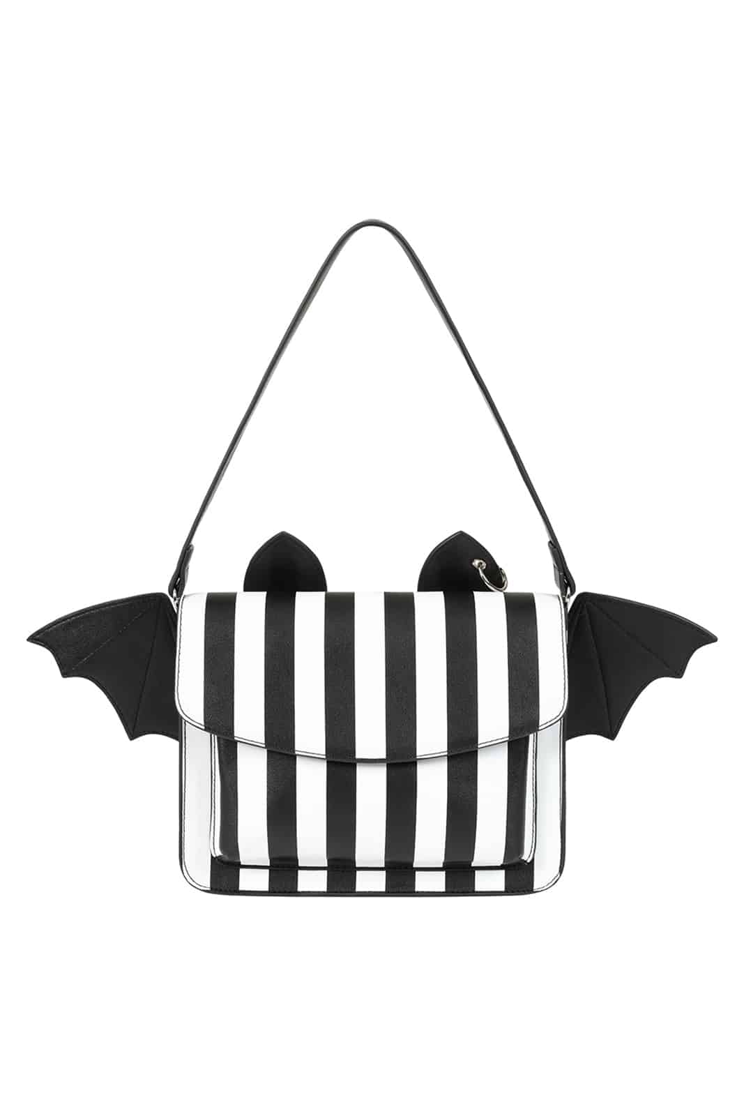 Diese auffällige Schultertasche von Banned vereint verspielten Gothic-Charme mit praktischer Alltagstauglichkeit. Das markante schwarz-weiße Streifenmuster wird von Fledermausflügeln und Katzenohren ergänzt, die dem Design eine freche, düstere Note verleihen. Zwei Trageoptionen – kurzer Henkel oder längerer Schultergurt – sorgen für Flexibilität, während das geräumige Innenfach mit zusätzlichen Taschen Platz für deine Essentials bietet. Ein Must-have für alle, die klassische Muster mit einem Hauch von Halloween kombinieren möchten.