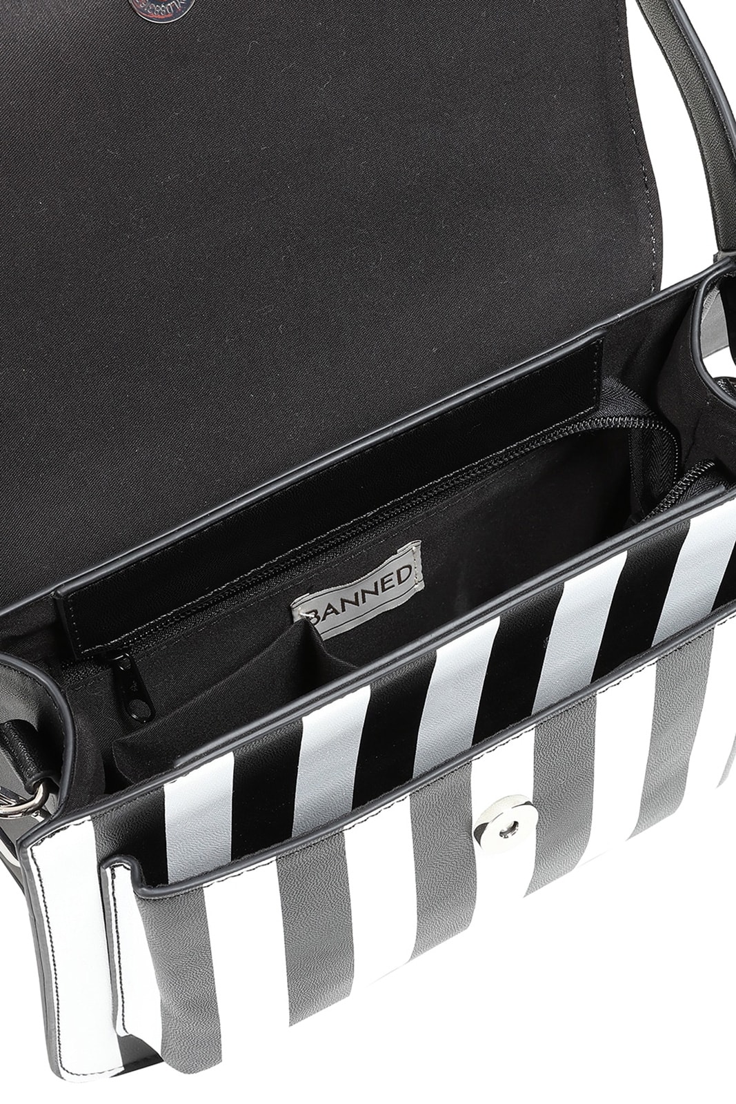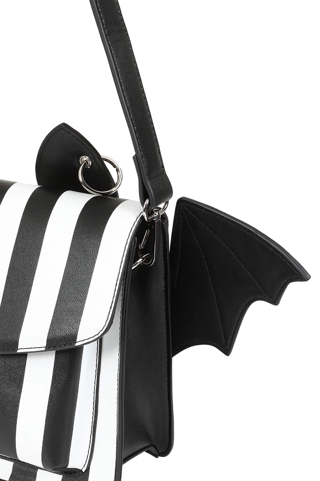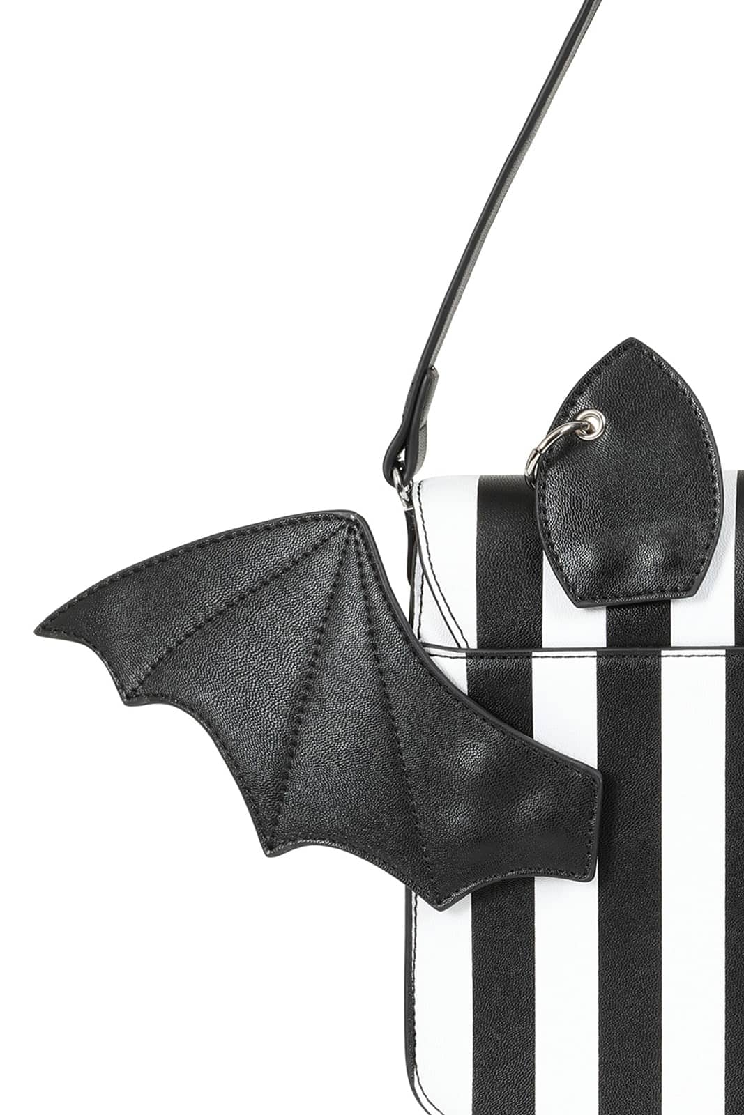 Diese auffällige Schultertasche von Banned vereint verspielten Gothic-Charme mit praktischer Alltagstauglichkeit. Das markante schwarz-weiße Streifenmuster wird von Fledermausflügeln und Katzenohren ergänzt, die dem Design eine freche, düstere Note verleihen. Zwei Trageoptionen – kurzer Henkel oder längerer Schultergurt – sorgen für Flexibilität, während das geräumige Innenfach mit zusätzlichen Taschen Platz für deine Essentials bietet. Ein Must-have für alle, die klassische Muster mit einem Hauch von Halloween kombinieren möchten.