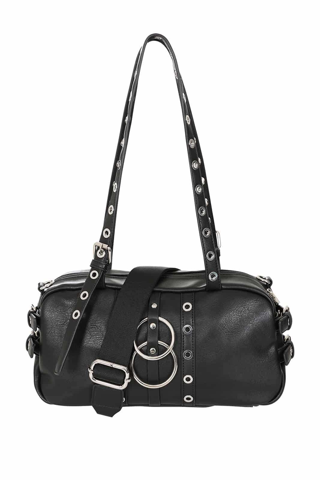 Diese vielseitige, zylindrische Tasche besticht durch die charakteristischen Doppel-O-Ringe und Ösendetails an den Trägern und der Vorderseite. Das praktische Design umfasst verstellbare Tragegriffe und einen abnehmbaren, gewebten Schultergurt für verschiedene Tragemöglichkeiten. Die tonnenförmige Silhouette verbindet alternative Mode mit funktionalem Design und eignet sich perfekt für den Alltag und als Statement-Styling.