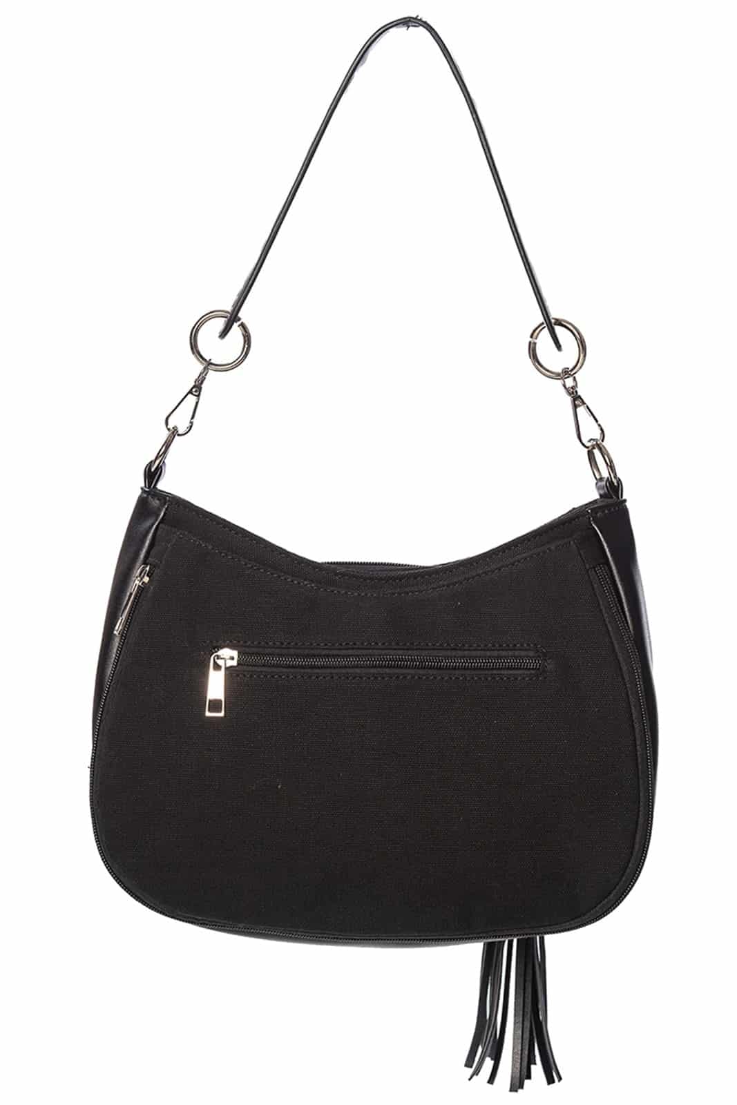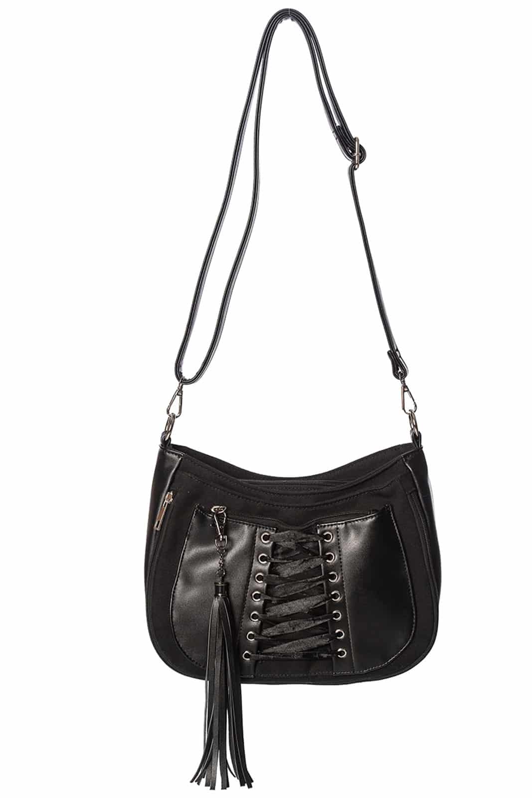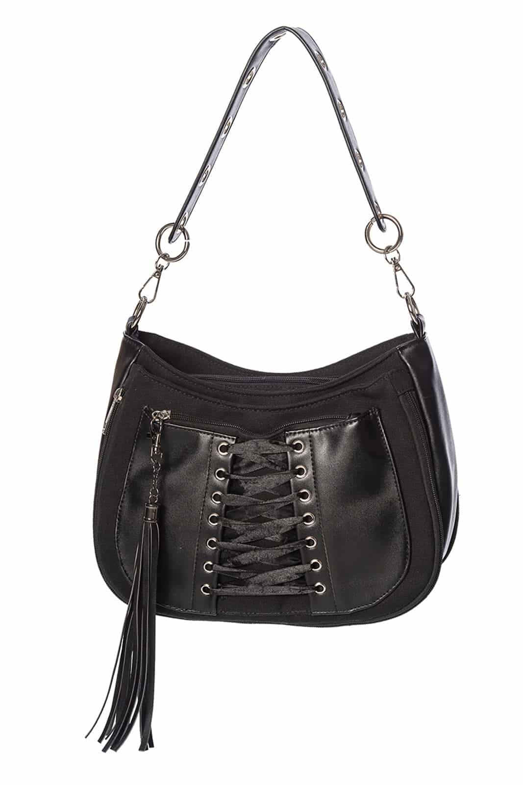 Gothic Umhängetasche mit Tragegriff aus hochwertigem Kunstleder. Die Vorderseite ist mit einer großen Fledermaus aus glänzendem Lackleder verziert. Die Tasche kann als Henkeltasche oder mit dem abnehmbaren Gurt als Umhängetasche genutzt werden.