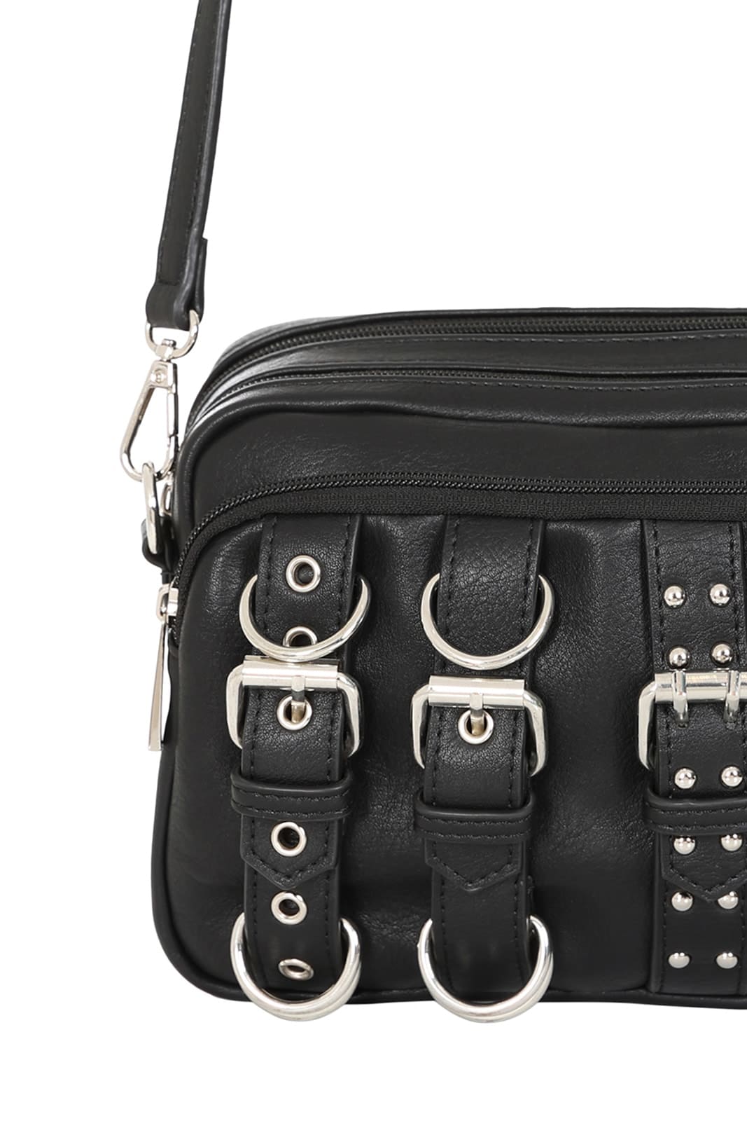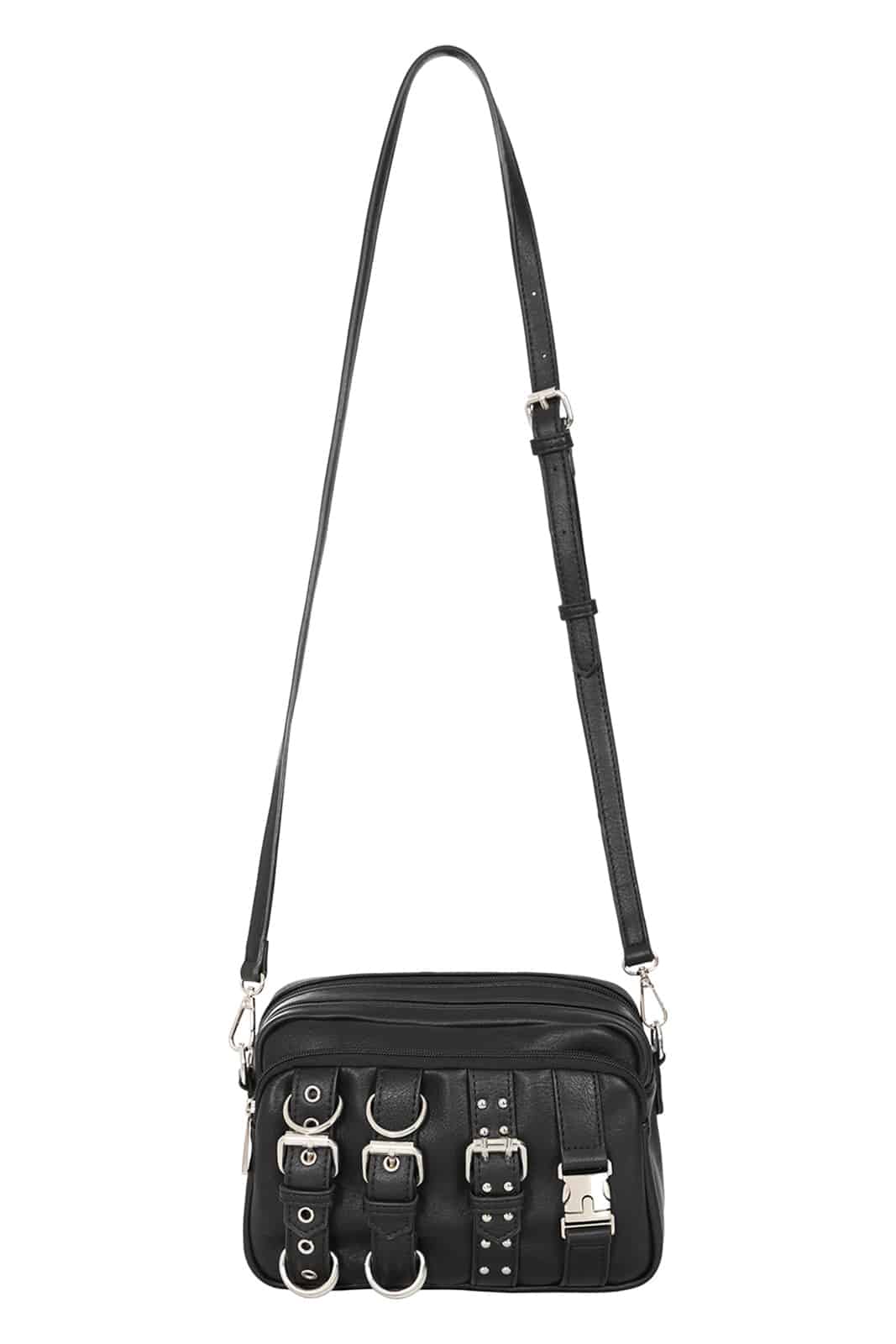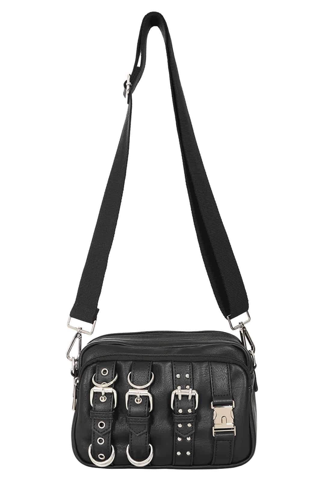 Diese Schultertasche von Banned kombiniert einen klaren Gothic-Style mit praktischer Alltagstauglichkeit. Gefertigt aus veganem Kunstleder, überzeugt sie durch markante Schnallen, Nieten und silberfarbene Hardware. Der verstellbare, gewebte Schulterriemen sorgt für angenehmen Tragekomfort, während mehrere Fächer genügend Platz für deine Essentials bieten. Eine perfekte Mischung aus edgy Design und Funktionalität.