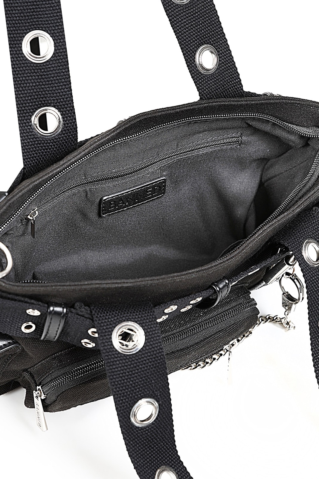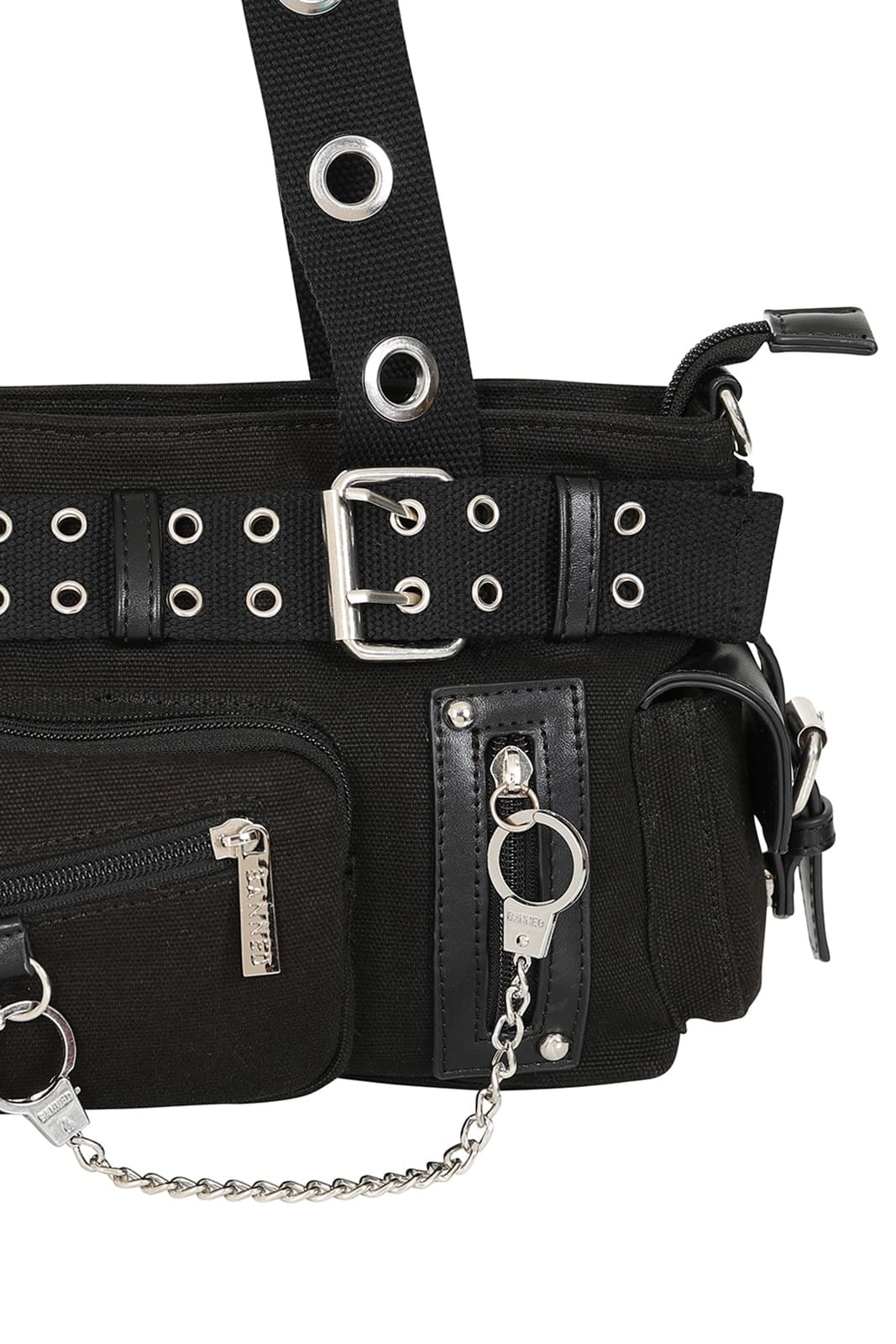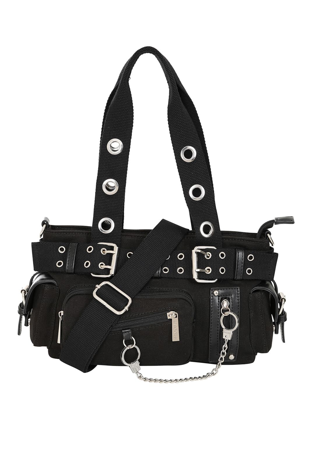 Diese Canvas Mini-Schultertasche von Banned kombiniert robuste Materialien mit markantem, alternativem Design. Große Ösen, Schnallen und silberfarbene Kettendetails verleihen der Tasche einen edgy Look, während mehrere Fächer und Reißverschlüsse für Funktionalität sorgen. Dank der abnehmbaren Schulterriemen kann die Tasche flexibel getragen werden – perfekt für Alltag oder besondere Anlässe.