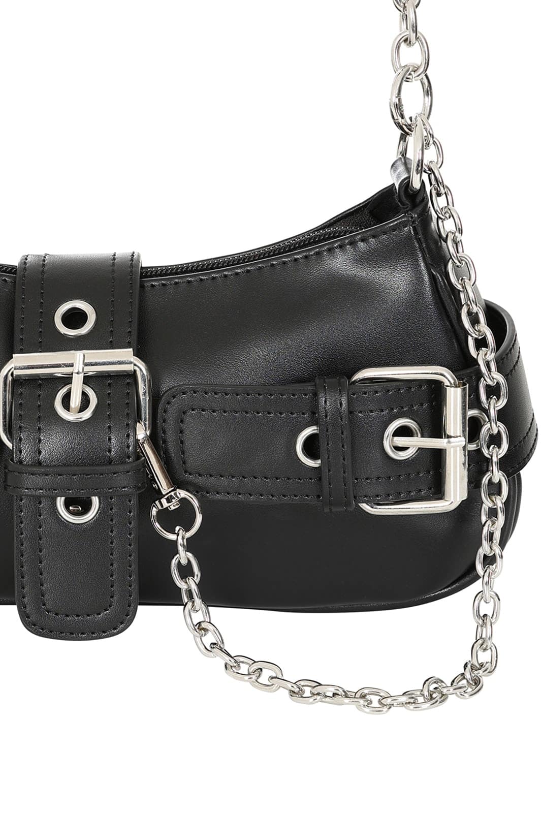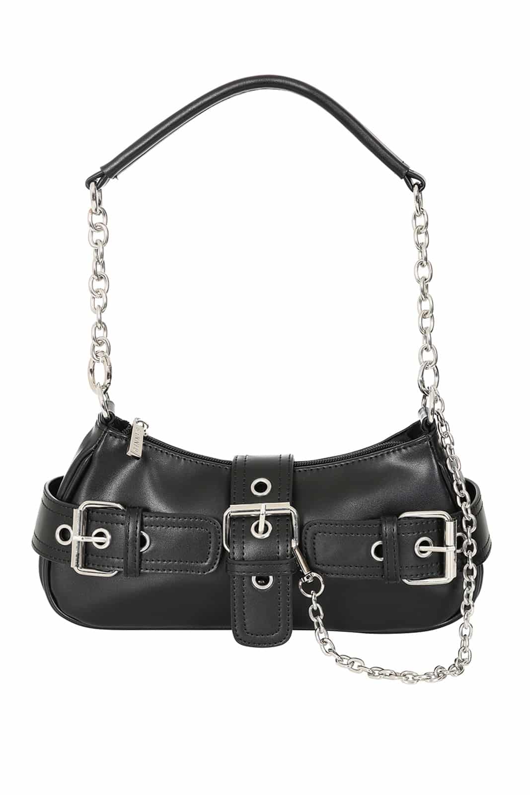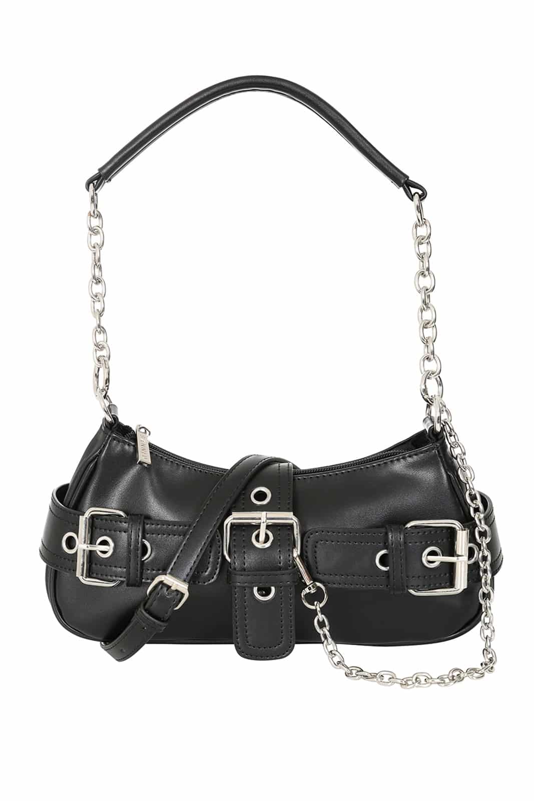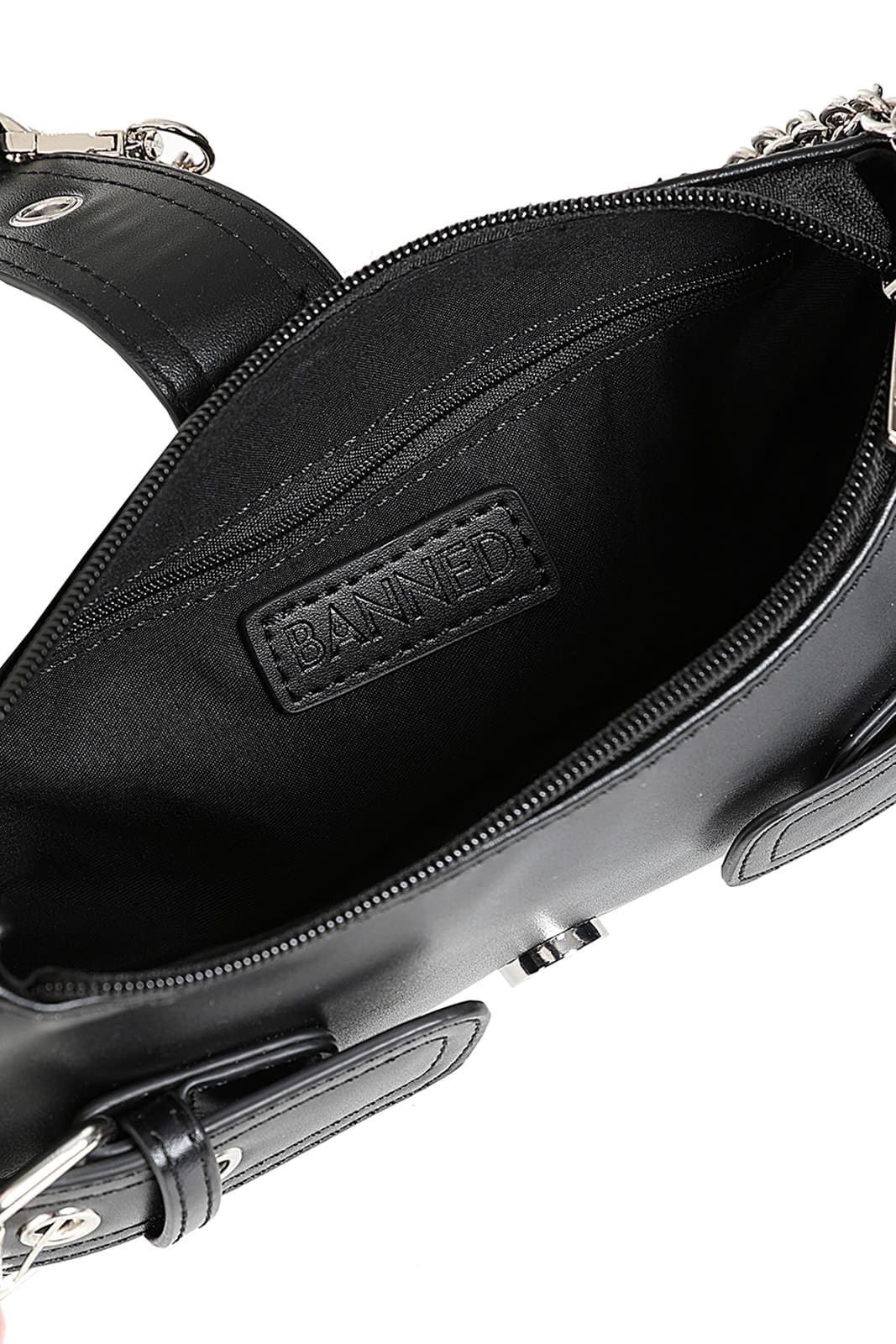 Diese elegante Baguette-Tasche von Banned kombiniert minimalistisches Design mit markanten Gothic-Details. Gefertigt aus schwarzem, veganem Kunstleder, überzeugt sie mit silberfarbener Hardware, dekorativen Schnallen und Metallösen. Der verstellbare Kettenriemen ermöglicht vielseitiges Tragen, während die kompakte Größe ideal für abendliche Outfits und alternative Styles ist.