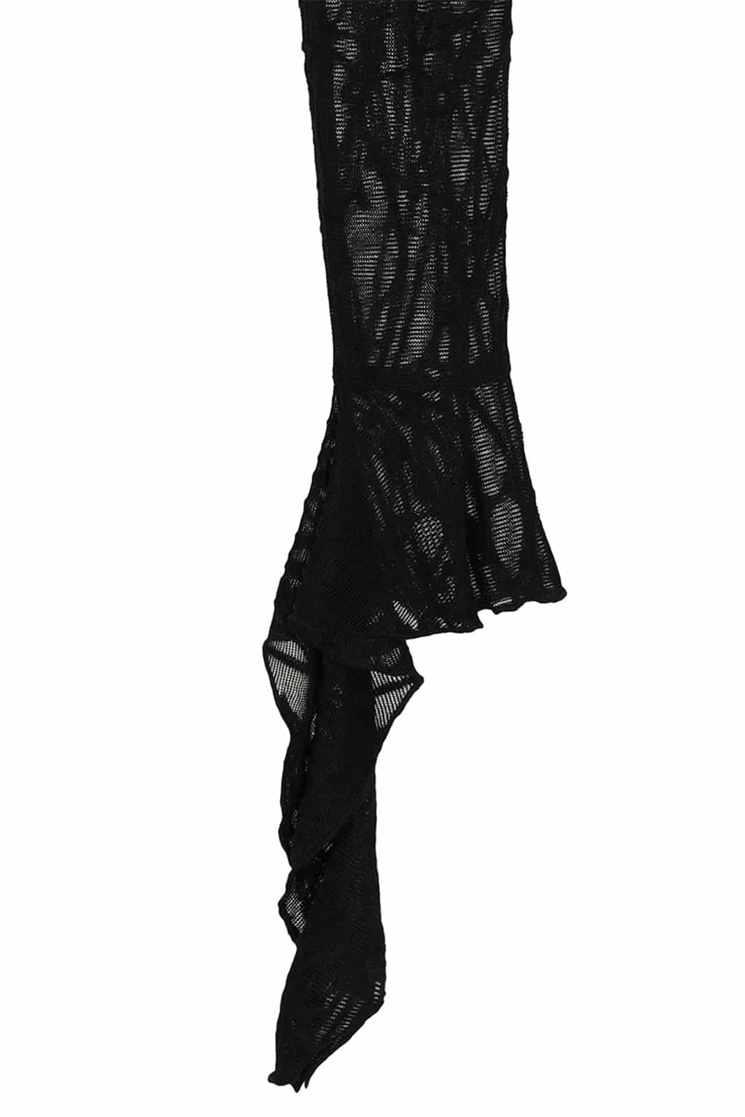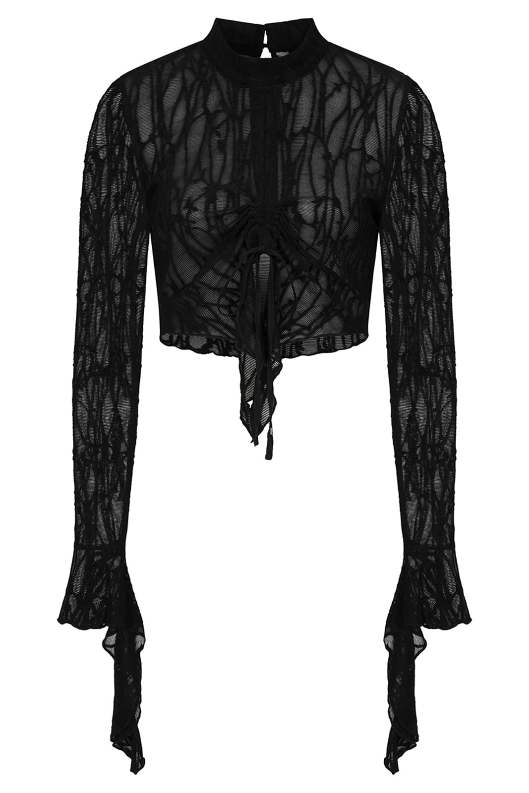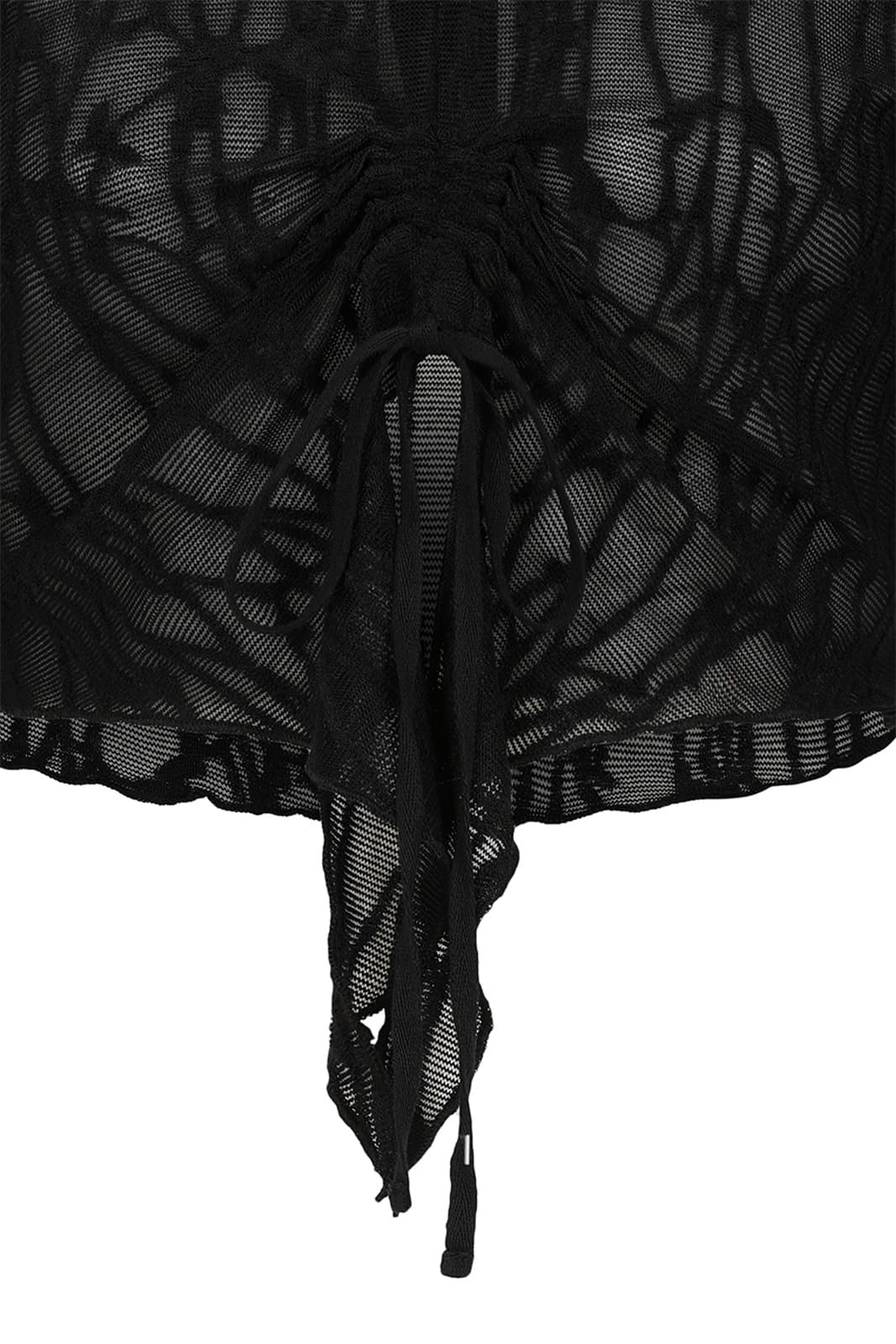 Dieses ausgefallene Mesh-Top besticht durch seine markante, strukturiert wirkende Oberfläche und einen eleganten, düsteren Look. Der hohe Kragen und die langen Ärmel mit dramatisch ausgestellten Manschetten verleihen dem Design eine raffinierte, gothic-inspirierte Silhouette. Im Vorderteil sorgt eine geraffte Partie mit verstellbaren Kordeln für eine individuelle Formgebung und zusätzliche Akzente. Hinten wird das Top mit zwei Knöpfen über einem dezenten Schlüssellochausschnitt geschlossen. Der asymmetrische Saum greift die fließenden Linien der Ärmel auf und rundet das außergewöhnliche Design harmonisch ab.