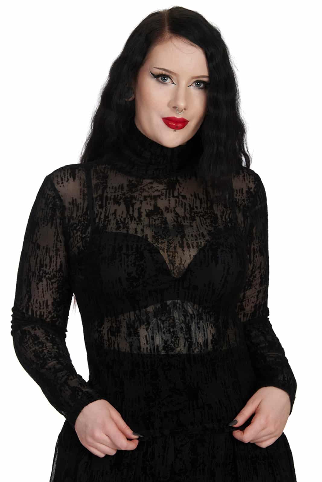 Weiches und dehnbares Gothic-Netzoberteil mit beflocktem Distressed-Detail. Mit hohem Halsausschnitt, langen Ärmel und tailliertem Schnitt.