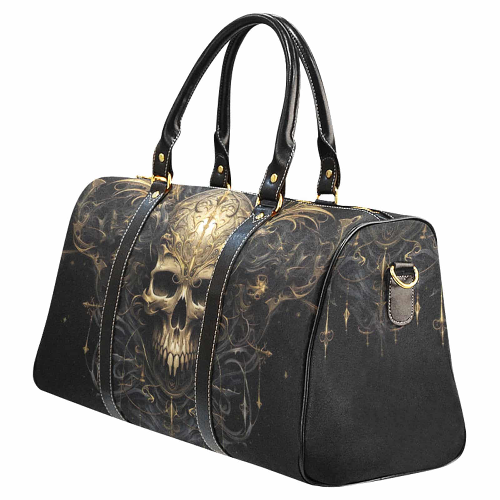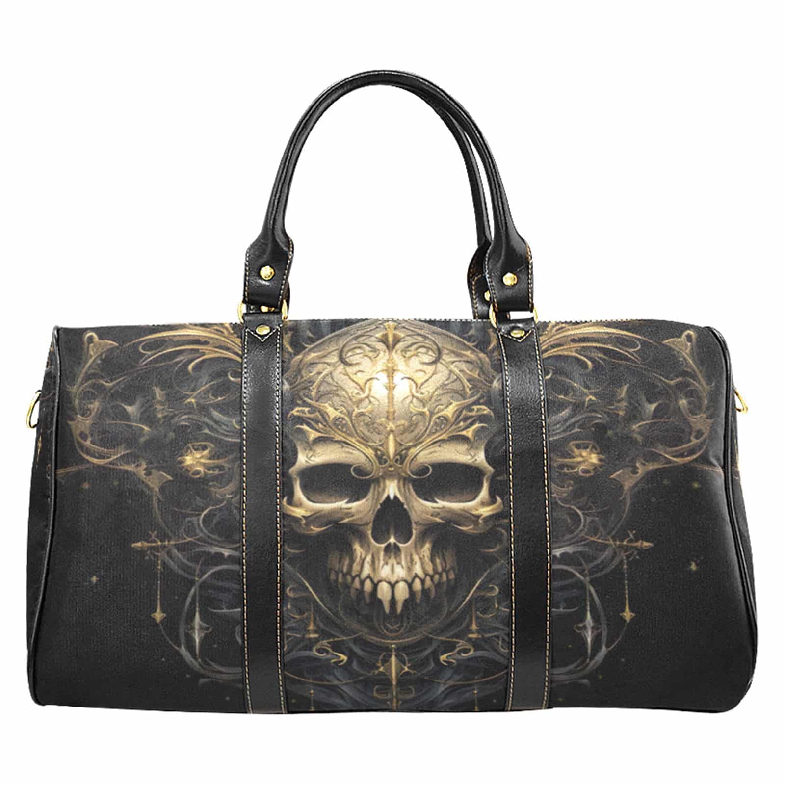 Wunderschöne, große Gothic-Reisetasche mit extravagantem Totenkopf-Print. Die Reisetasche ist aus wasserdichtem Material gefertigt und verfügt über ein großes Hauptfach, eine Innentasche mit Reißverschluss und einen zusätzlichen Schultergurt.