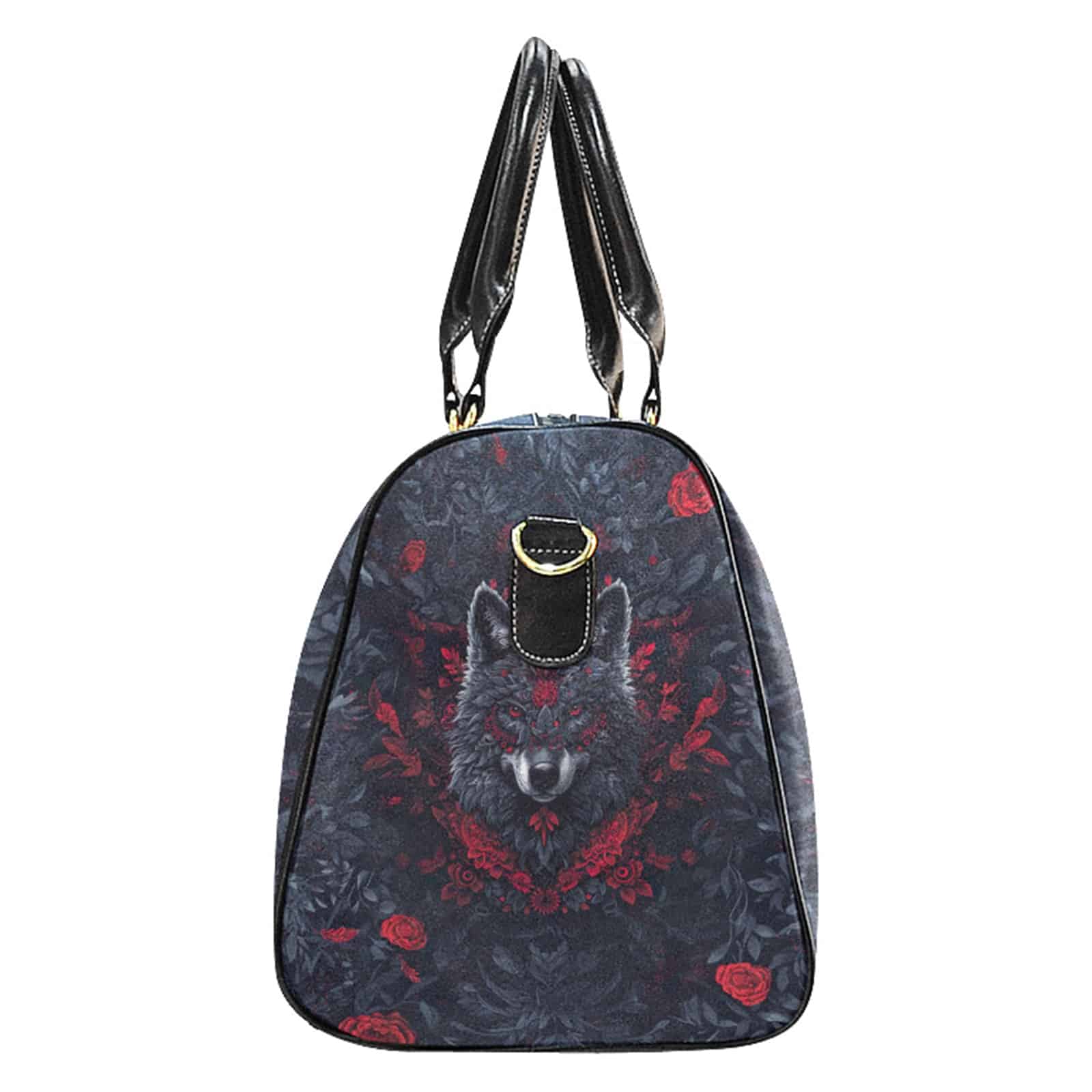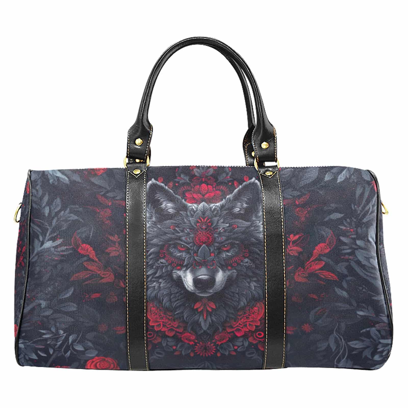 Wunderschöne, große Gothic-Reisetasche mit schaurig-schönem Wolf-Allover-Print. Die Reisetasche ist aus wasserdichtem Material gefertigt und verfügt über ein großes Hauptfach, eine Innentasche mit Reißverschluss und einen zusätzlichen Schultergurt.
