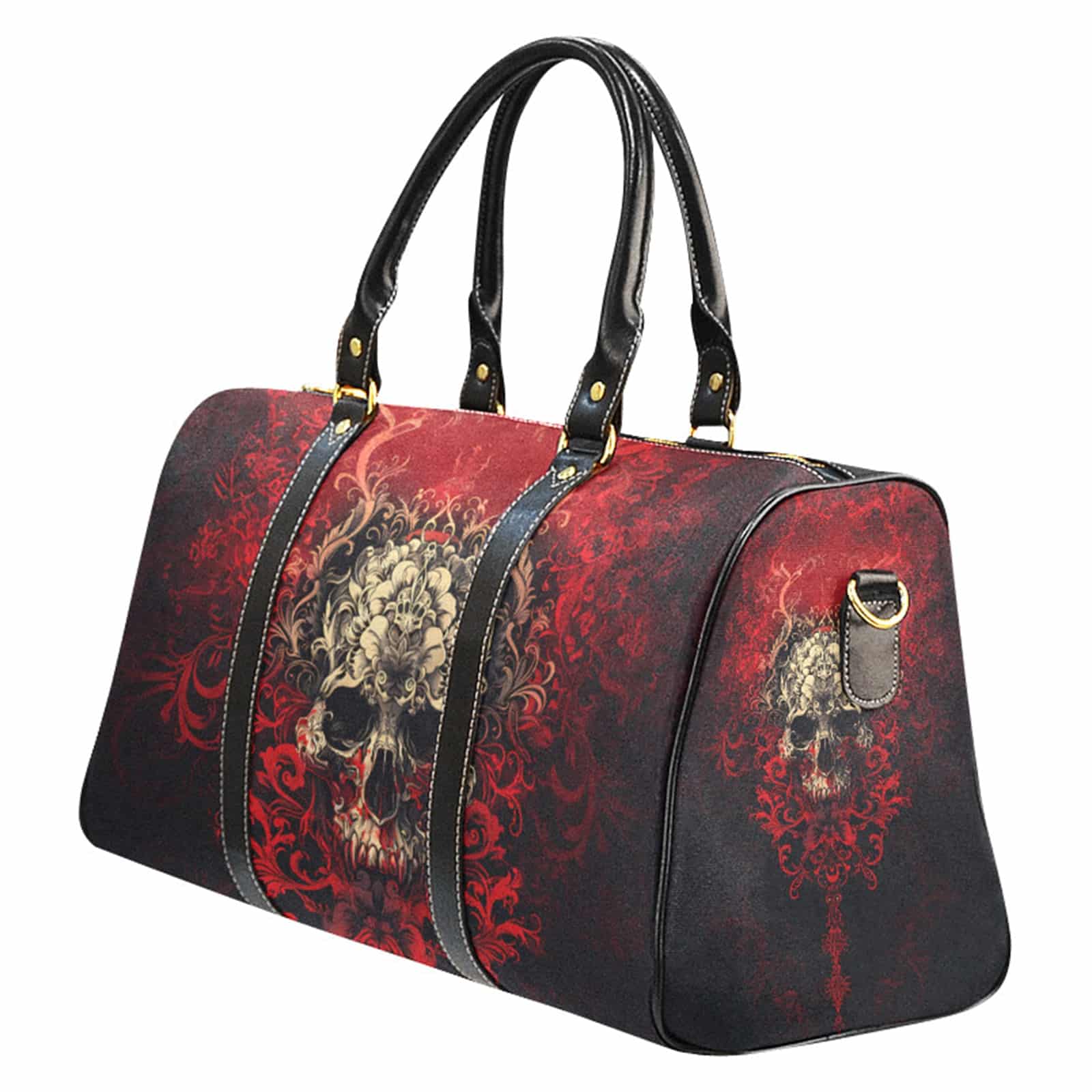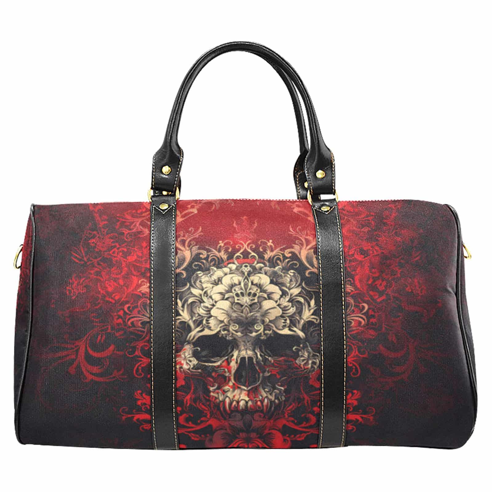 Wunderschöne, große Gothic-Reisetasche mit coolem Totenkopf-Print auf rotem Grund. Die Reisetasche ist aus wasserdichtem Material gefertigt und verfügt über ein großes Hauptfach, eine Innentasche mit Reißverschluss und einen zusätzlichen Schultergurt.