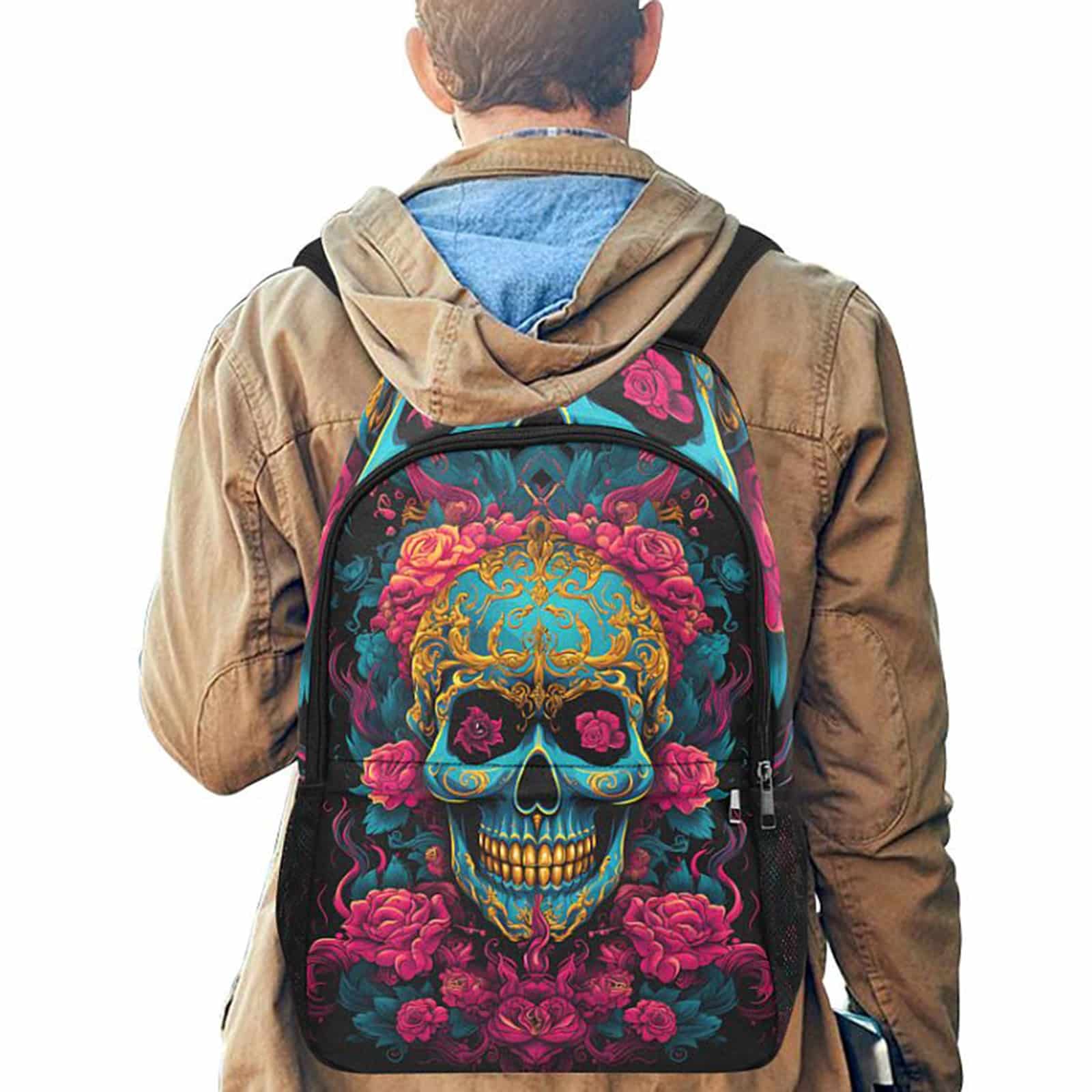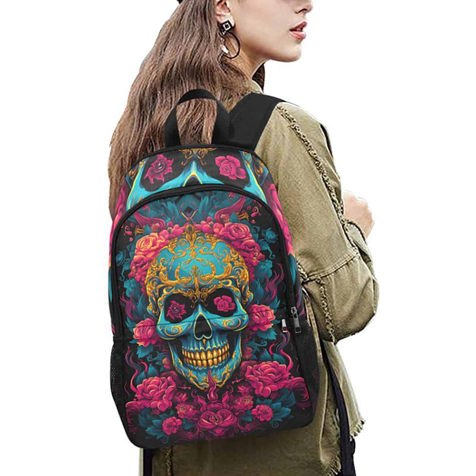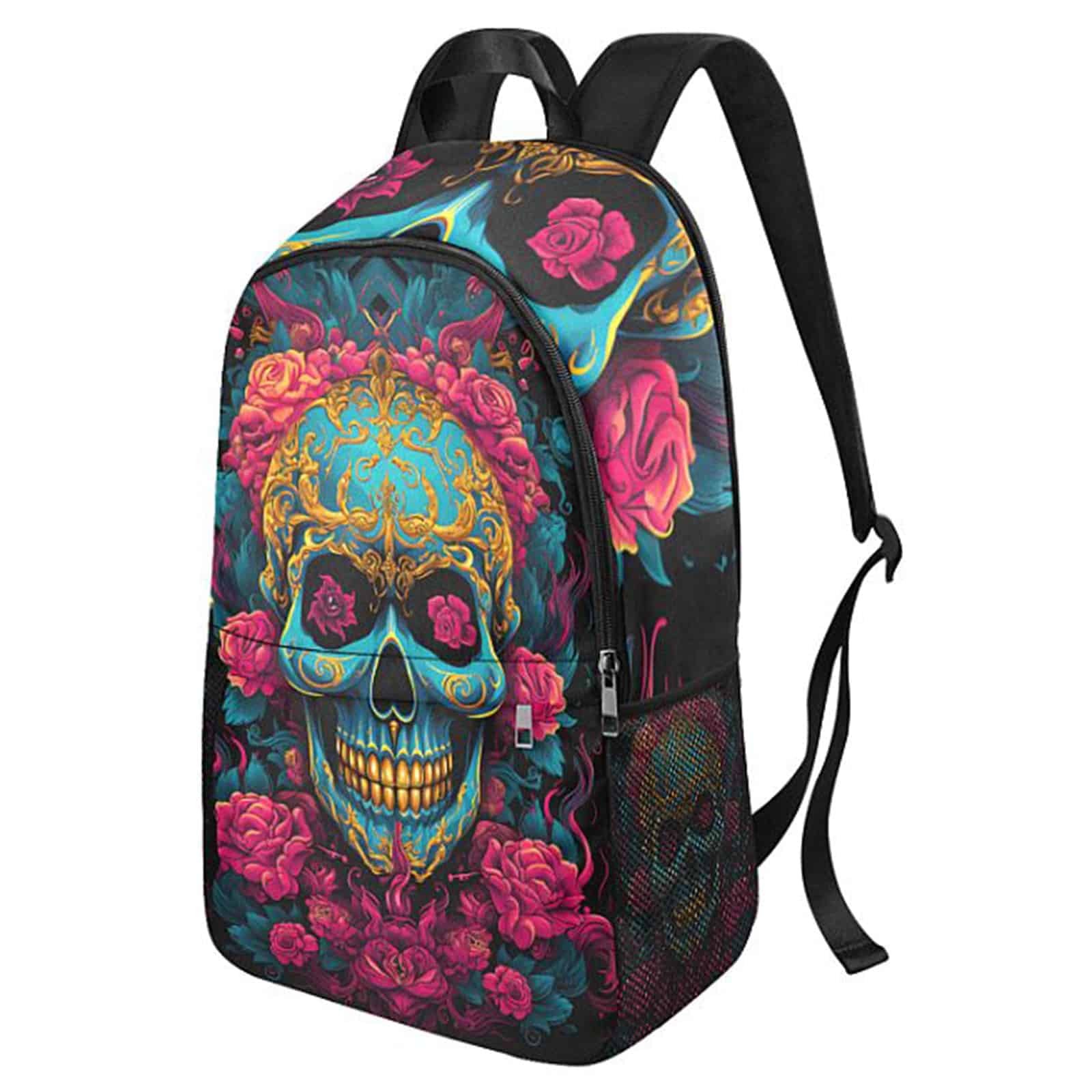 Gothic-Rucksack mit buntem Sugarskull-Allover-Print. Der Rucksack verfügt über seitliche Netztaschen, ein zusätzliches Außenfach, einen gepolsterten Rücken und verstellbare Schultergurte.