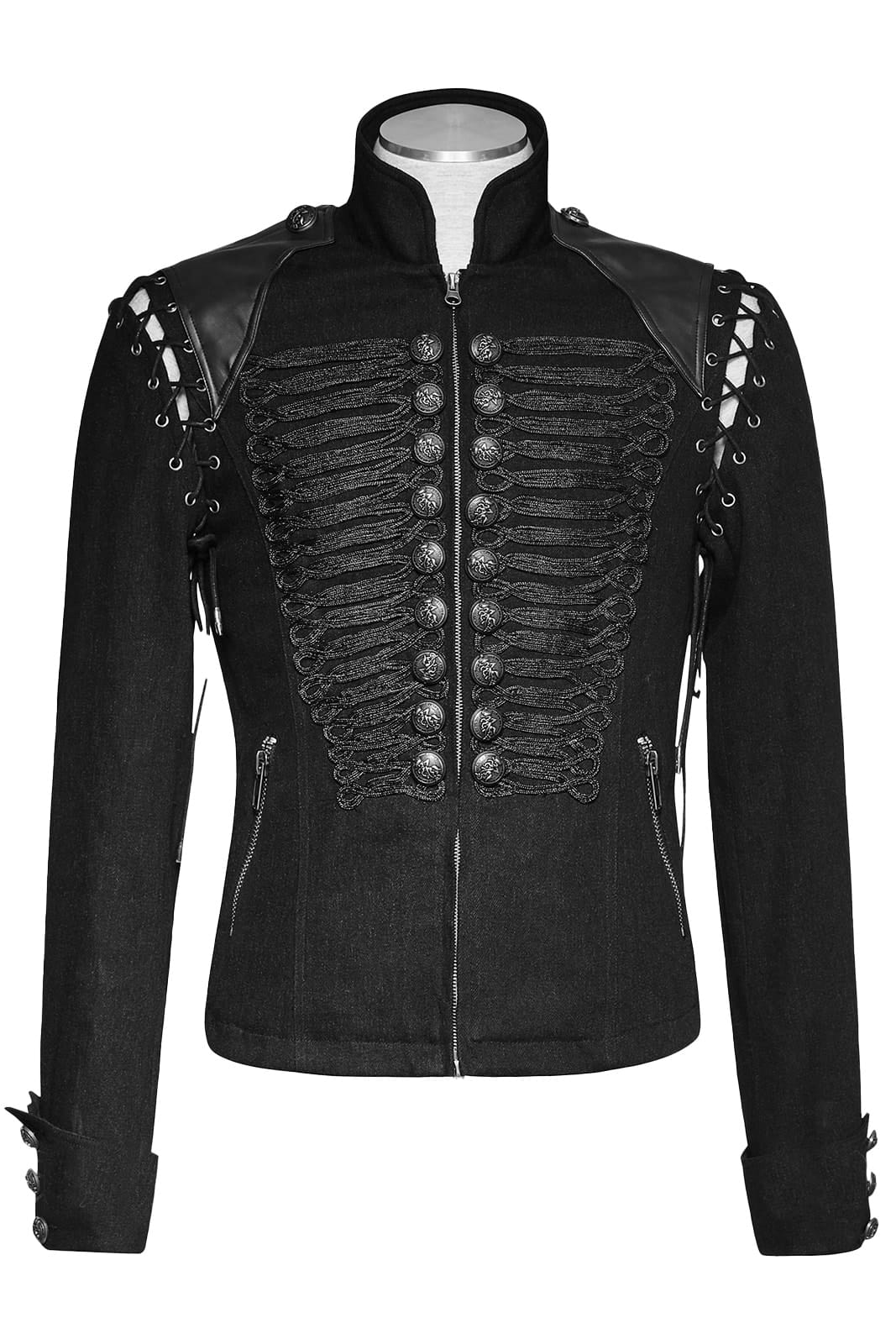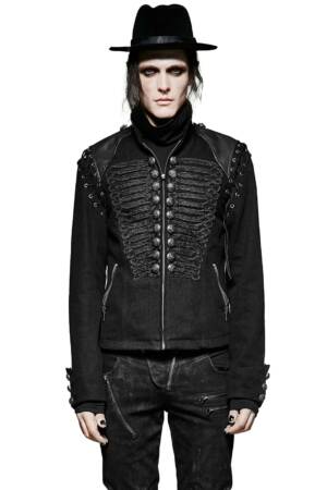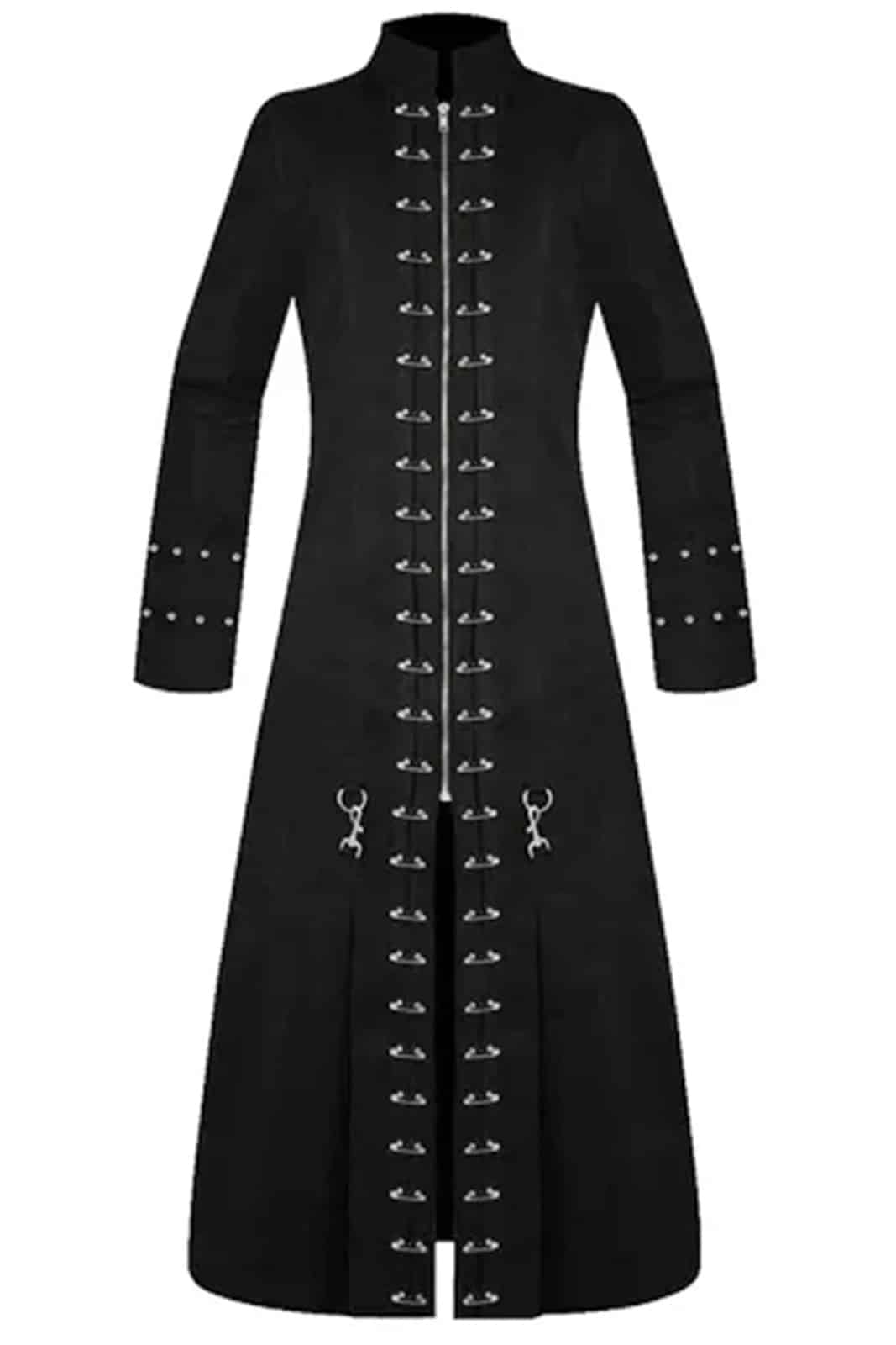 Ein Mantel wie ein sakrales Versprechen: Schwarzer, schwerer Stoff formt eine schlanke Gothic-Silhouette, während zwei Reihen silbriger Hakenverschlüsse den Blick wie Runen der Unterwelt leiten. Ein hoher Priesterkragen rahmt den Nacken, genietetete Manschetten erinnern an Büßer­bänder, und die dezenten O-Ring-Applikationen wirken wie Reliquien verborgener Rituale.
