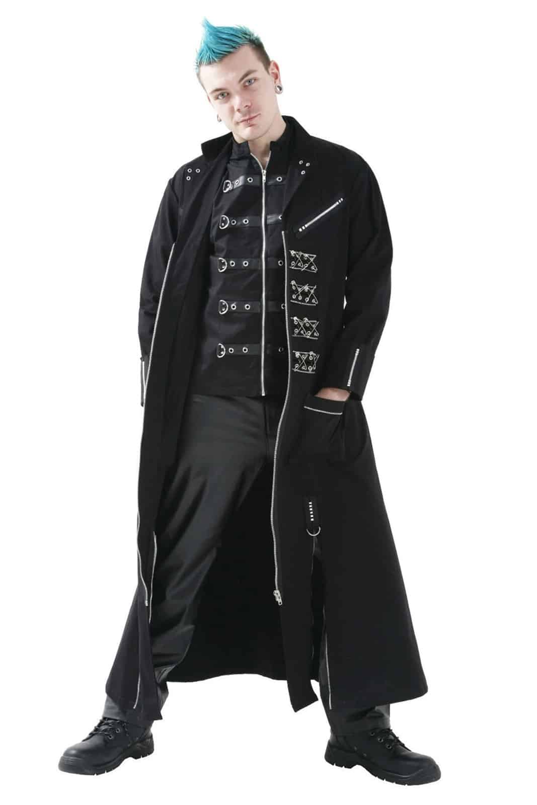 Dieser Gothic-Mantel gleicht dem Gewand eines urbanen Nachtwandlers – erschaffen für jene, die zwischen den Welten wandeln, irgendwo zwischen Ritual und Rebellion. Mit seinen silbernen Reißverschlüssen, Schnallenakzenten und symbolischer Rückenverschnürung wirkt er wie die moderne Rüstung eines neugeborenen Vampyri – eines dunklen Wanderers, der sich nicht versteckt, sondern herrscht.