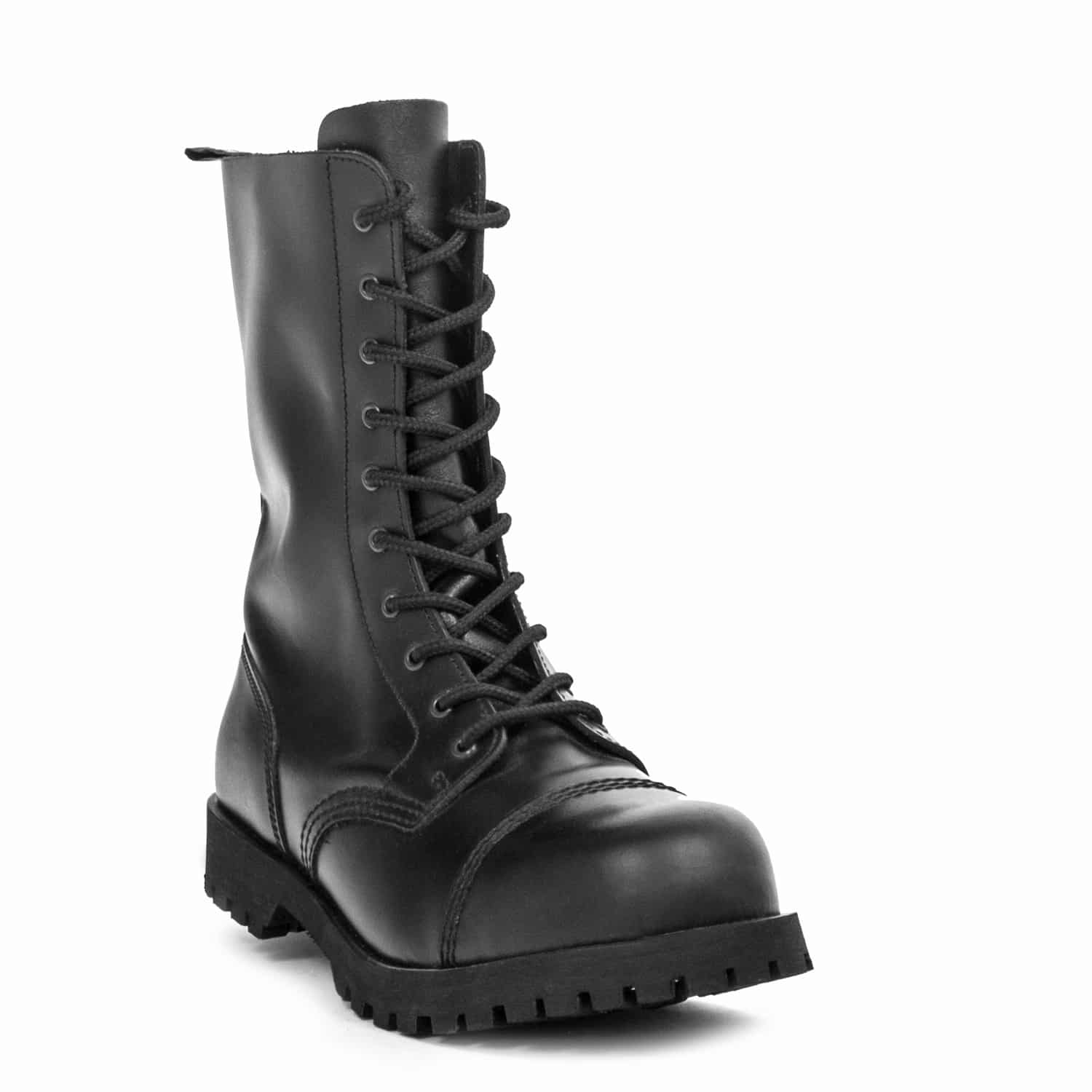 10-Loch Stiefel mit Stahlkappe und geschraubter Sohle aus Gummi.