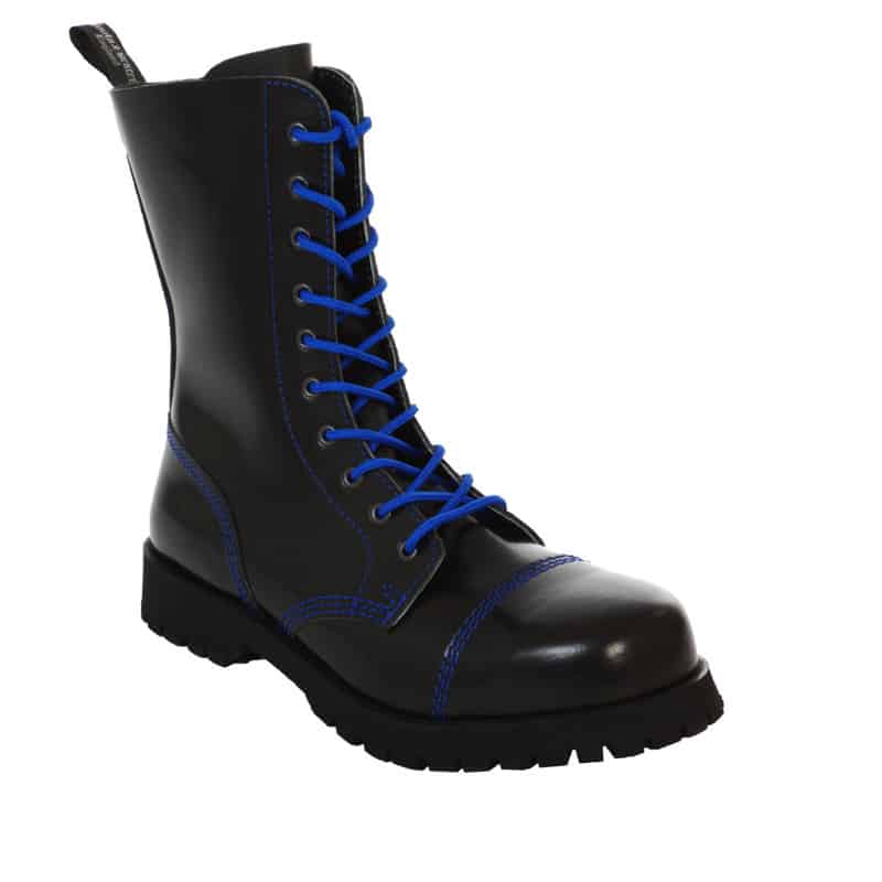 10-Loch Stiefel mit blauer Naht und blauen Schnürsenkeln, Stahlkappe und geschraubter Sohle aus Gummi.