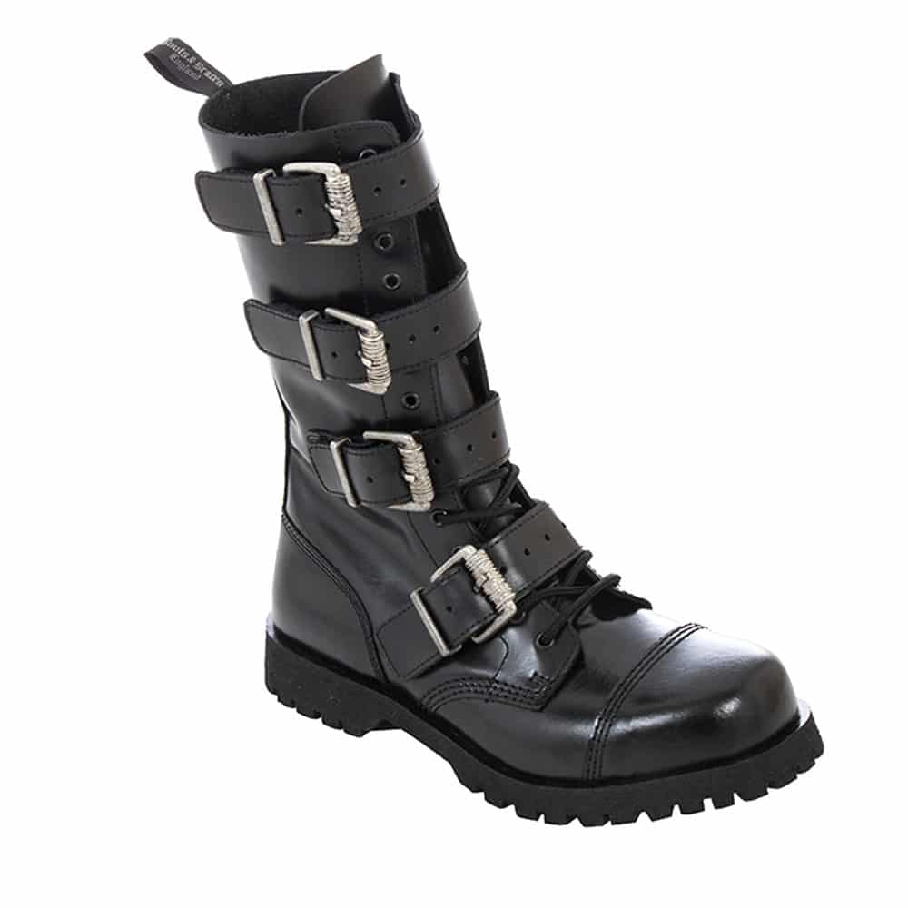 14-Loch Stiefel mit Riemen und vier schweren Schnallen. Ausgestattet mit Stahlkappe und Gummisohle mit Zierschrauben.