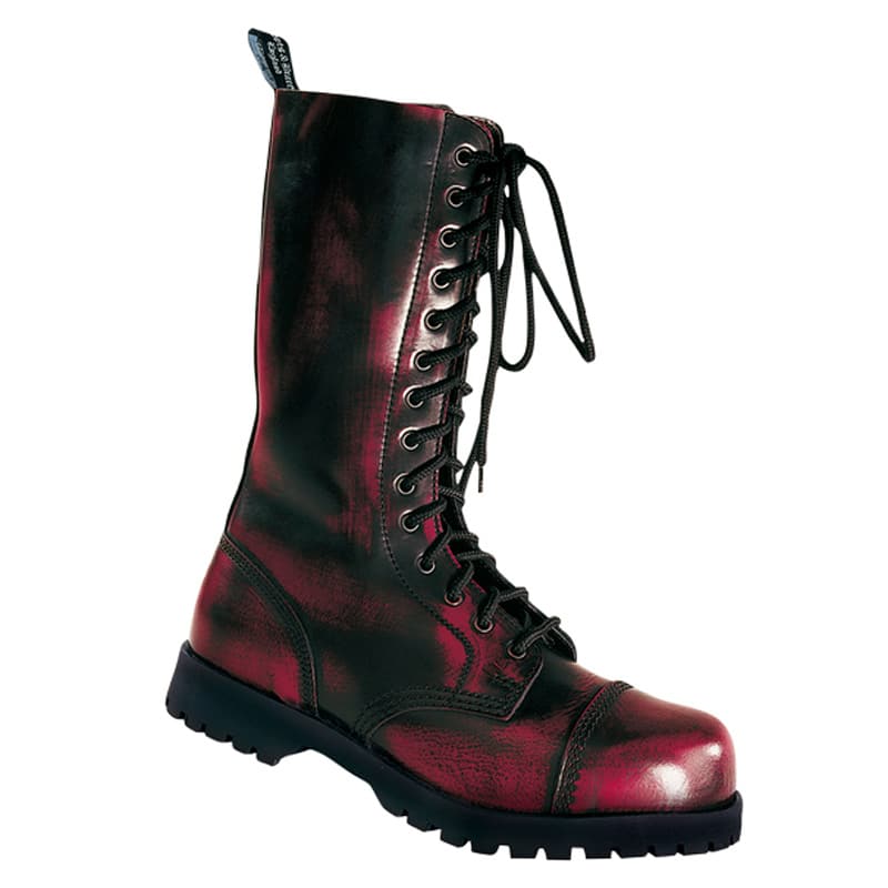 Klassischer 14-Loch Stiefel aus hochwertigem Leder. Mit eingenähter Stahlkappe und Gummisohle mit Zierschrauben. Dank der asymmetrischen Leisten bequemer als gerade geschnittene Modelle.