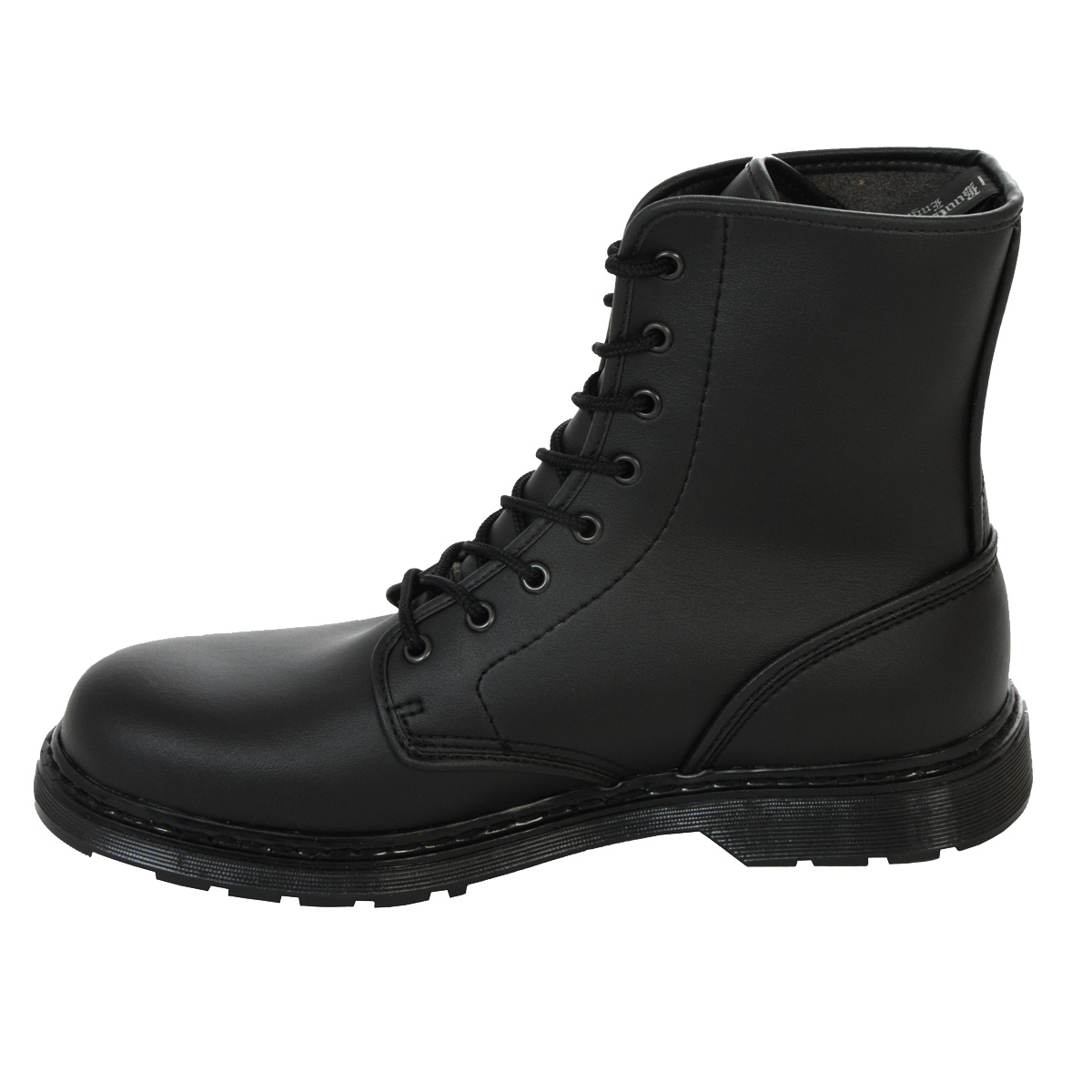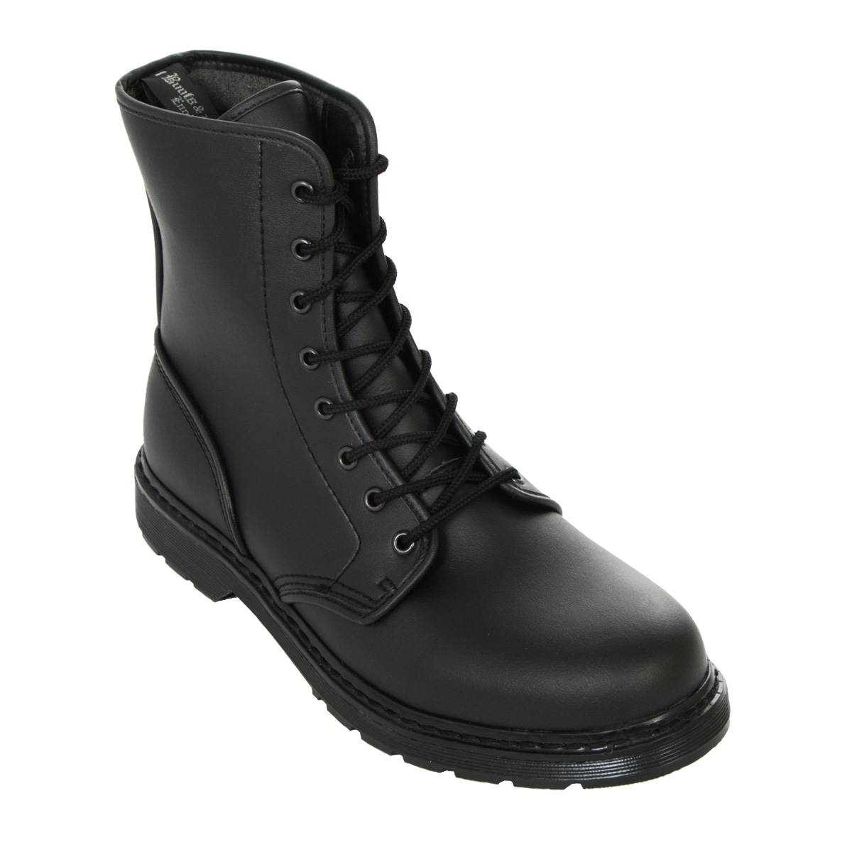 Klassischer 8-Loch Stiefel aus Kunsteder mit leichter Kunststoff-Sohle. Ohne Stahlkappe. Angenehmer Tragekomfort aufgrund des geringen Gewichtes. Aus der Boots & Braces Vegan Reihe, made in Europe